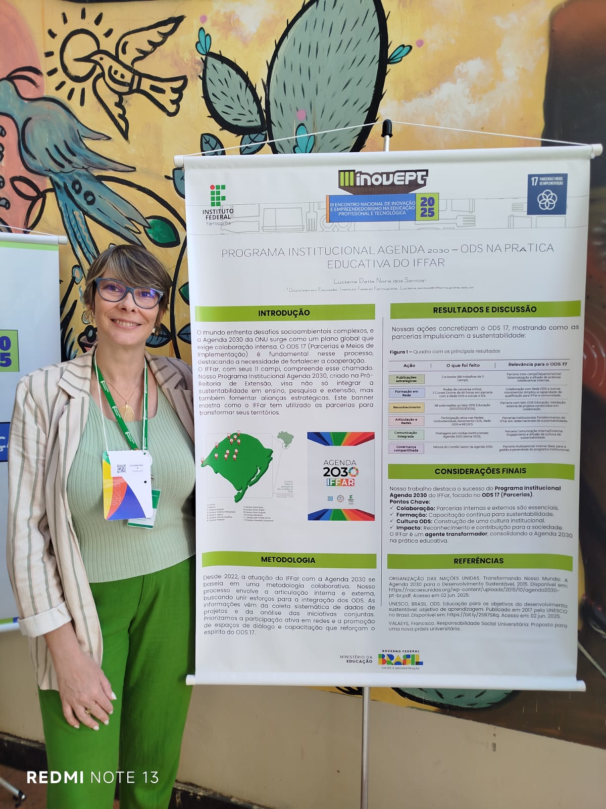 A professora Luciana Dalla Nora dos Santos também integrou o Seminário de Sustentabilidade, apresentando o trabalho “Programa Institucional Agenda 2030: ODS na prática educativa do IFFar” com foco no ODS 17, Parcerias e Meios de Implementação. A docente ressaltou a importância das parcerias institucionais e da formação colaborativa para integrar os ODS ao cotidiano escolar: “Foi gratificante mostrar como a colaboração do IFFar promove transformações em nossos territórios. Retorno do evento com a convicção de que estamos no rumo certo, fortalecendo nossas redes e ampliando nosso impacto na construção de um futuro mais sustentável”.