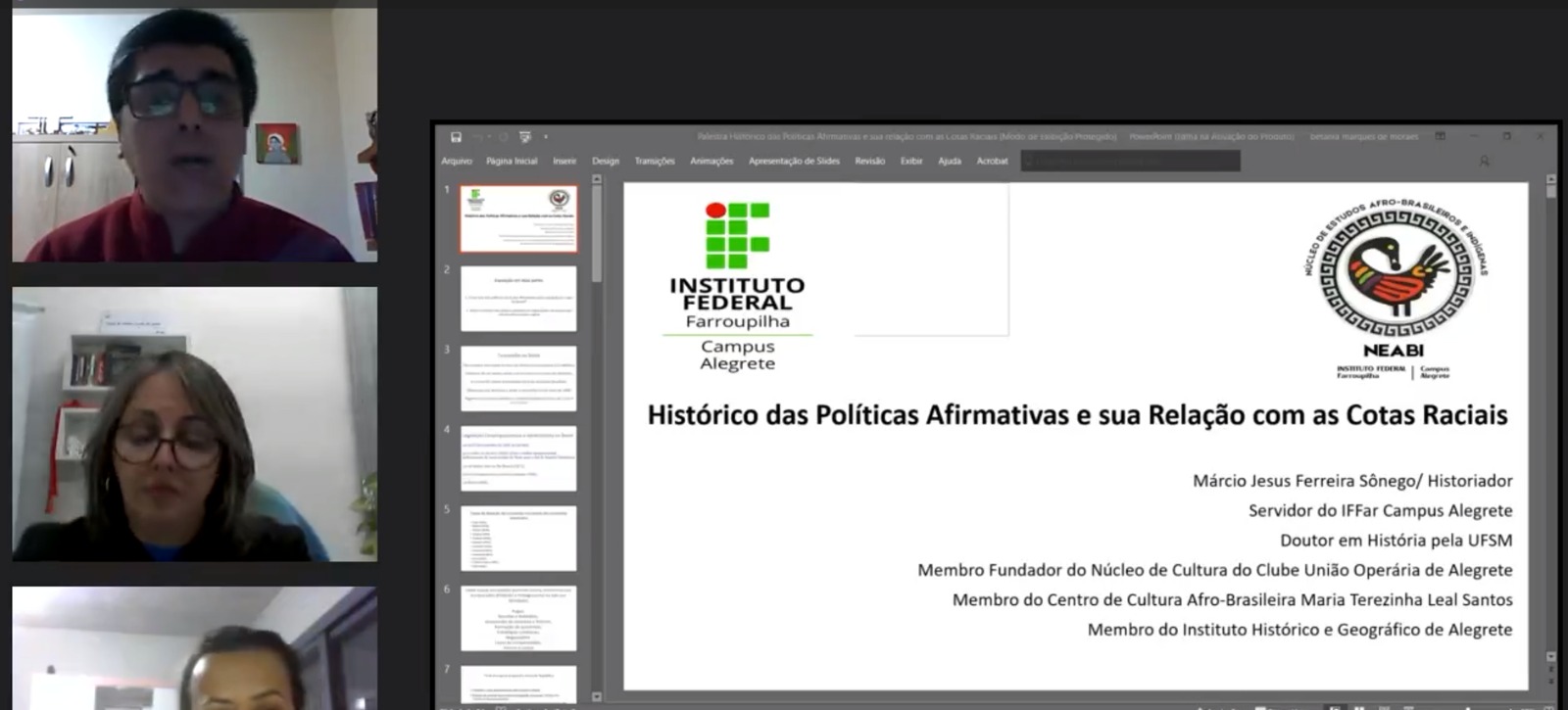 O primeiro encontro teve como tema “Histórico das Políticas Afirmativas e sua relação com as Cotas Raciais” e foi conduzido pelo professor Márcio Sônego, servidor do campus Alegrete, onde atua na Coordenação de Ações Afirmativas e nos núcleos inclusivos, principalmente no NEABI (Núcleo de Estudos Afro-Brasileiros e Indígenas). A atividade foi dividida em dois momentos: no primeiro, discutiu-se a importância das ações afirmativas no Brasil; no segundo, foi apresentada uma breve trajetória das ideias e projetos de reparação propostos pelos movimentos sociais negros ao longo da história.