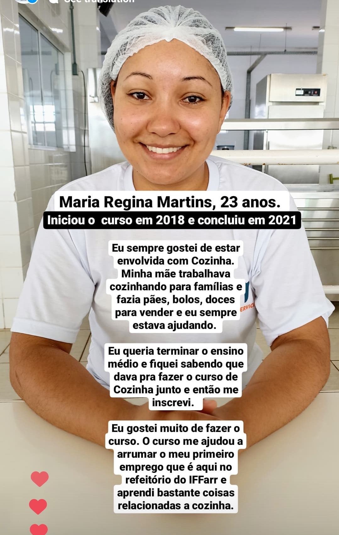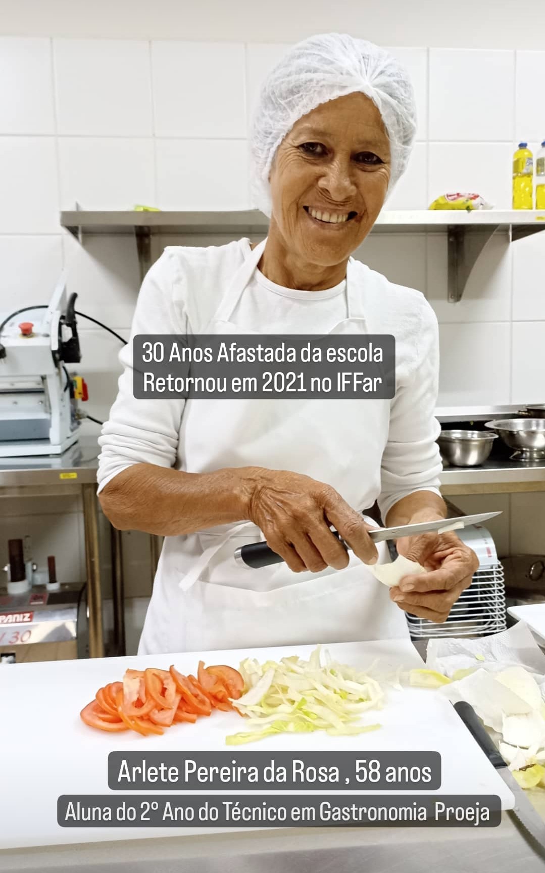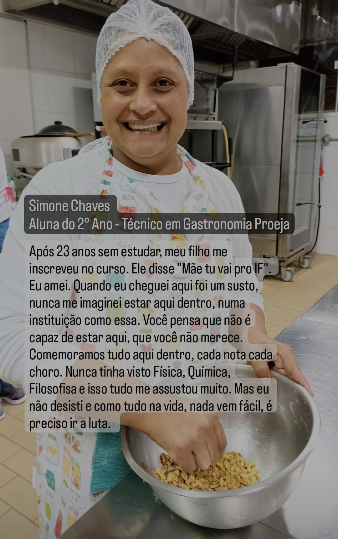 Depoimento da aluna aluna formada no curso, Fátima Navarro, que após concluir o curso, começou a trabalhar no refeitório do IFFar como Cozinheira.