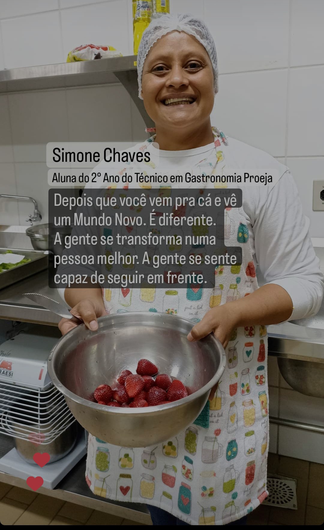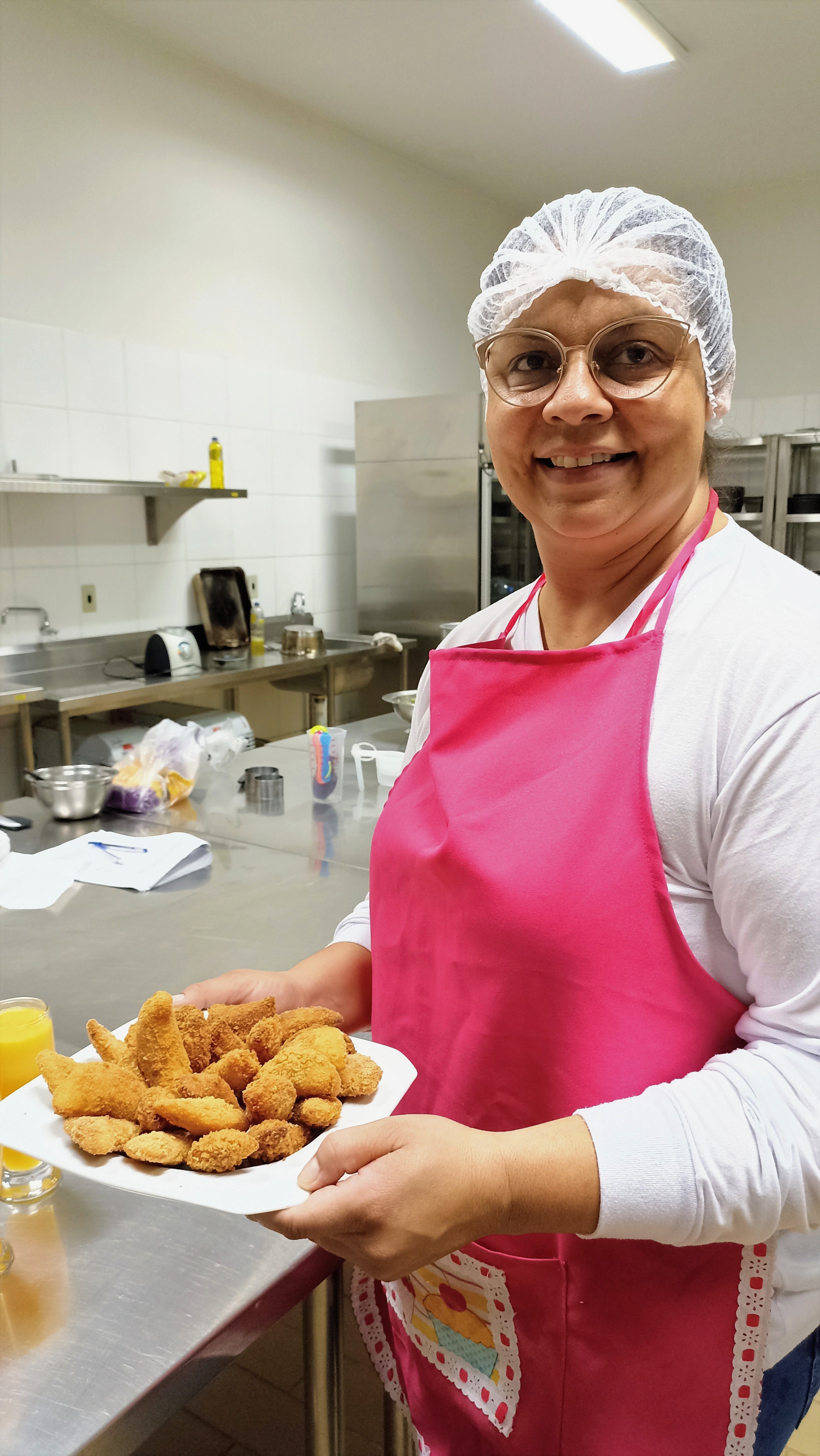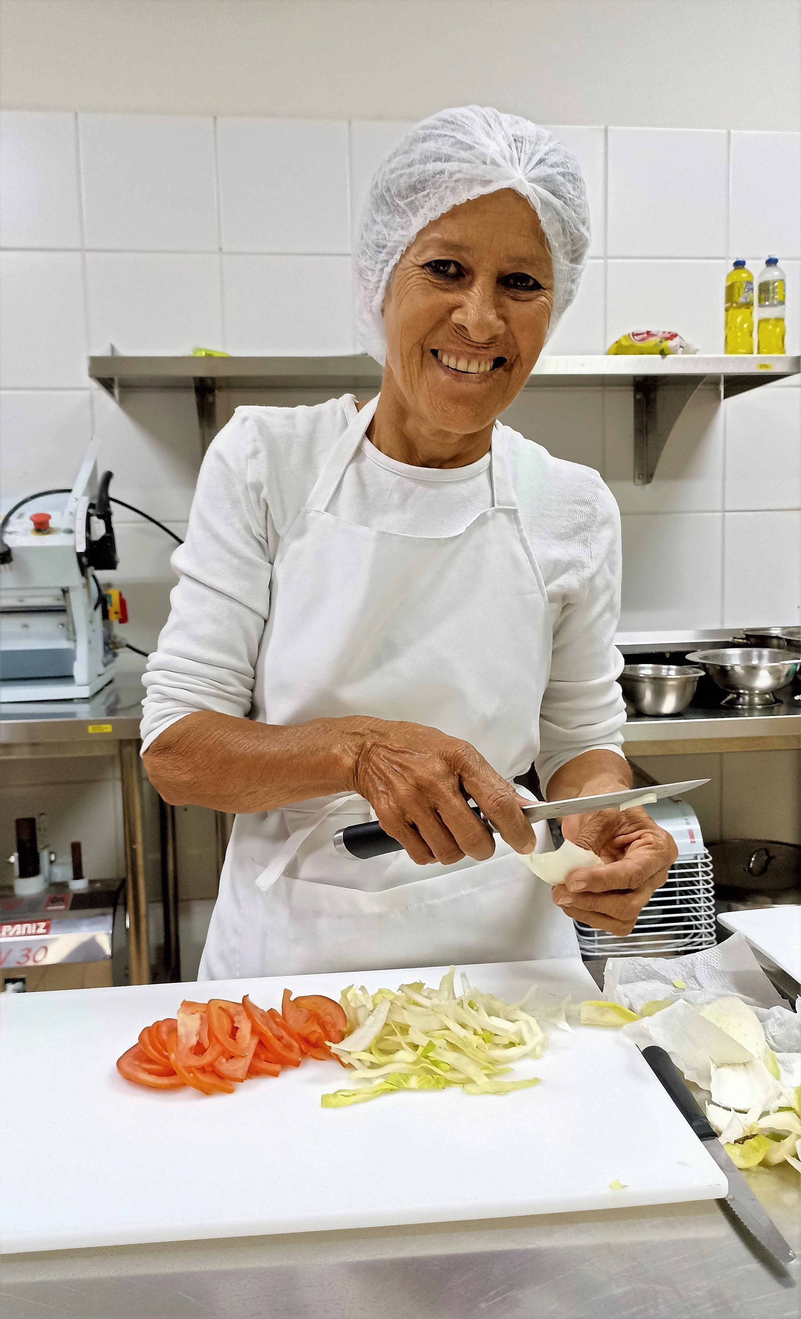 Depoimento da aluna aluna formada no curso, Fátima Navarro, que após concluir o curso, começou a trabalhar no refeitório do IFFar como Cozinheira.