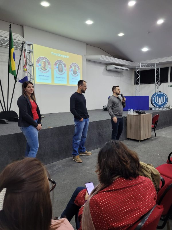 Foto: André, Eder e Charline participam de um evento de formação de professores no auditório da URI - Campus Santiago, com o lançamento da parceria Compartir IFFar - Canva For Education - Santiago.