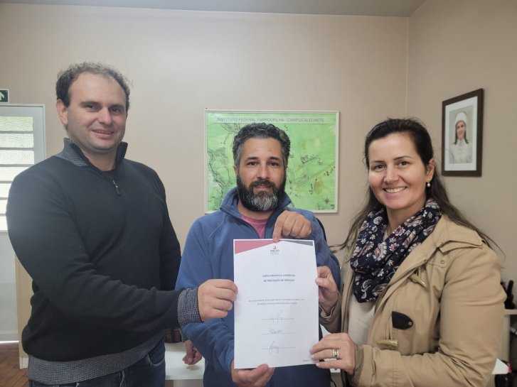 Foto: (da esq. p/ dir.) diretor de Pesquisa, Extensão e Produção, Douglas Dalla Nora, coordenador do projeto de pesquisa, Emmanuel de Camargo, e diretora geral do Campus Alegrete, Ana Rita Parizi