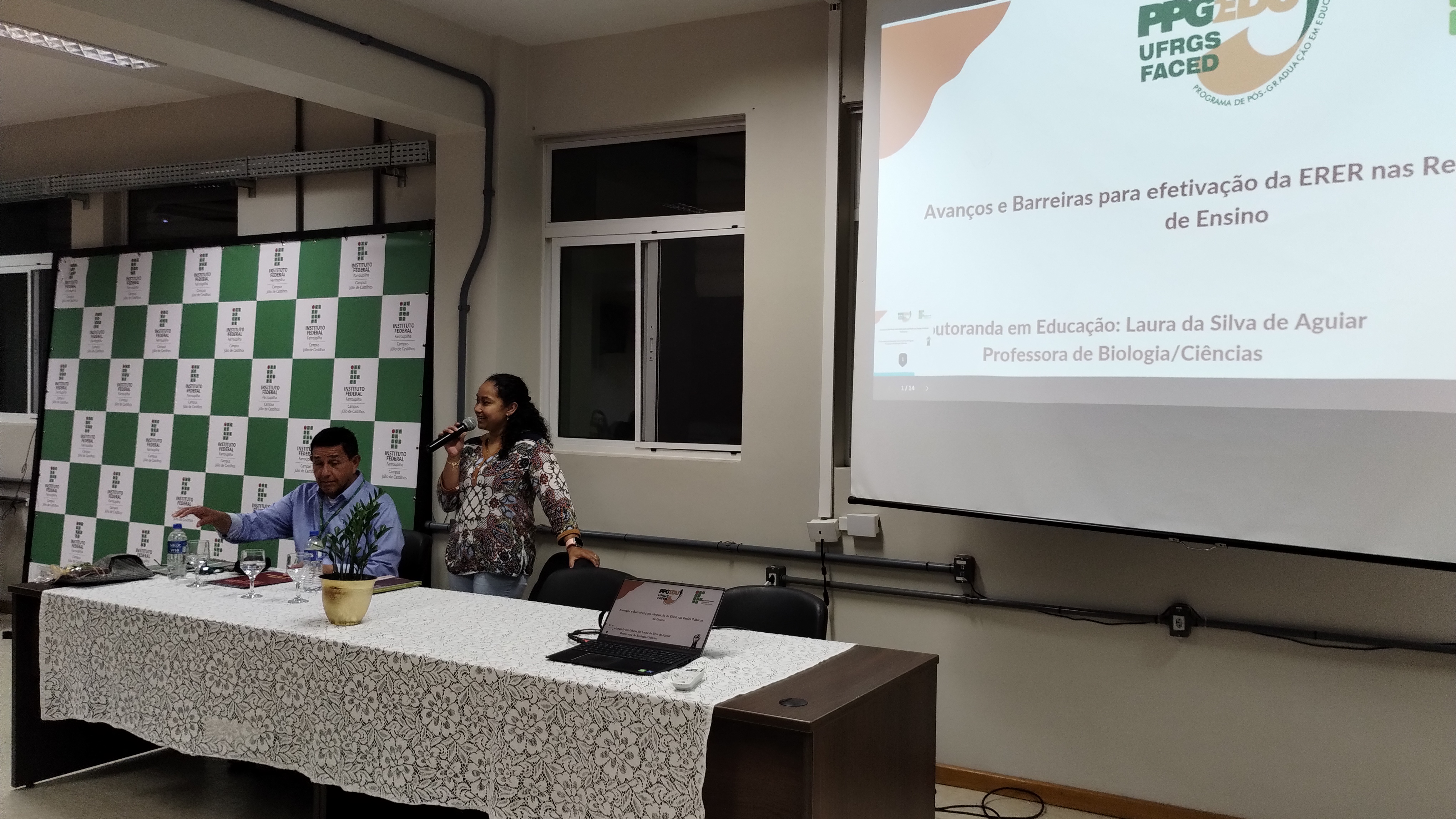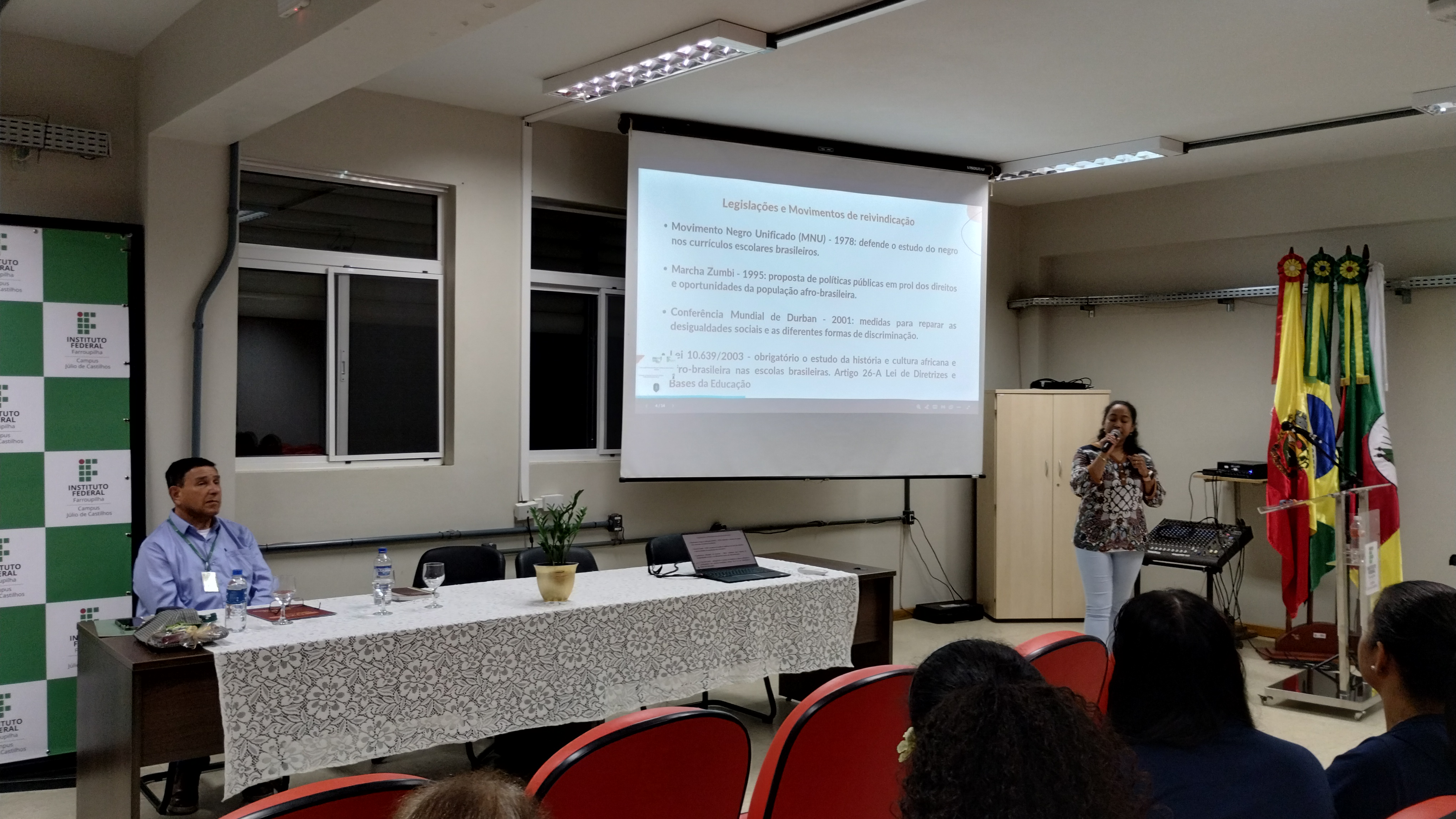 Com o tema “Avanços e barreiras para efetivação da Educação para as Relações Étnico-Raciais (ERER) nas escolas públicas”, a palestra foi ministrada por Laura da Silva de Aguiar, mestre e doutoranda em Educação pela Universidade Federal do Rio Grande do Sul (UFRGS). Ela é egressa do curso técnico em agropecuária e da licenciatura em ciências biológicas do IFFar – Campus de Júlio de Castilhos.