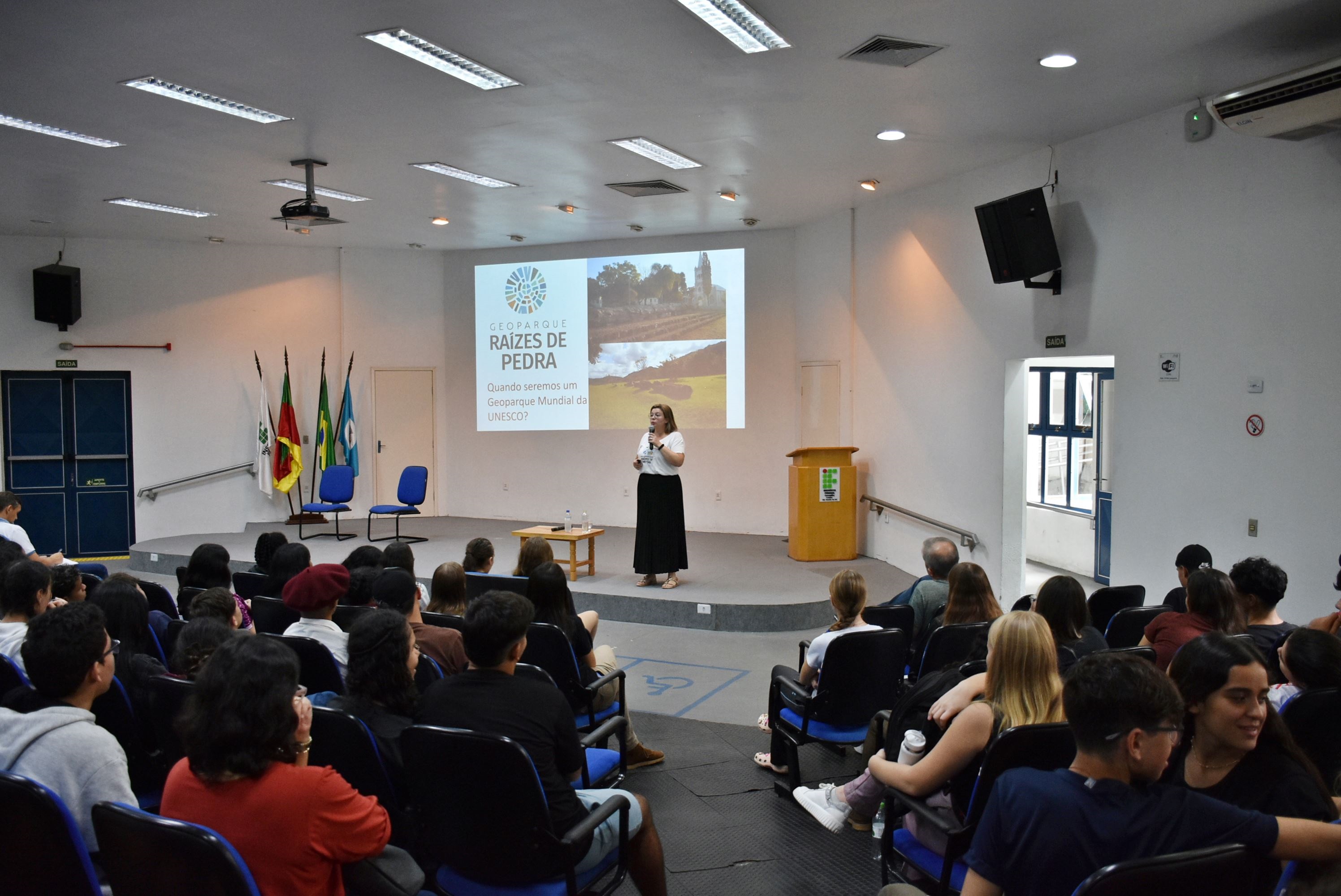 Na tarde do dia 20 de março, estudantes dos Cursos Técnicos Integrados do Instituto Federal Farroupilha – Campus São Vicente do Sul participaram de uma palestra sobre geoparque. A atividade também foi realizada no turno da noite, contemplando os estudantes dos cursos superiores da instituição.