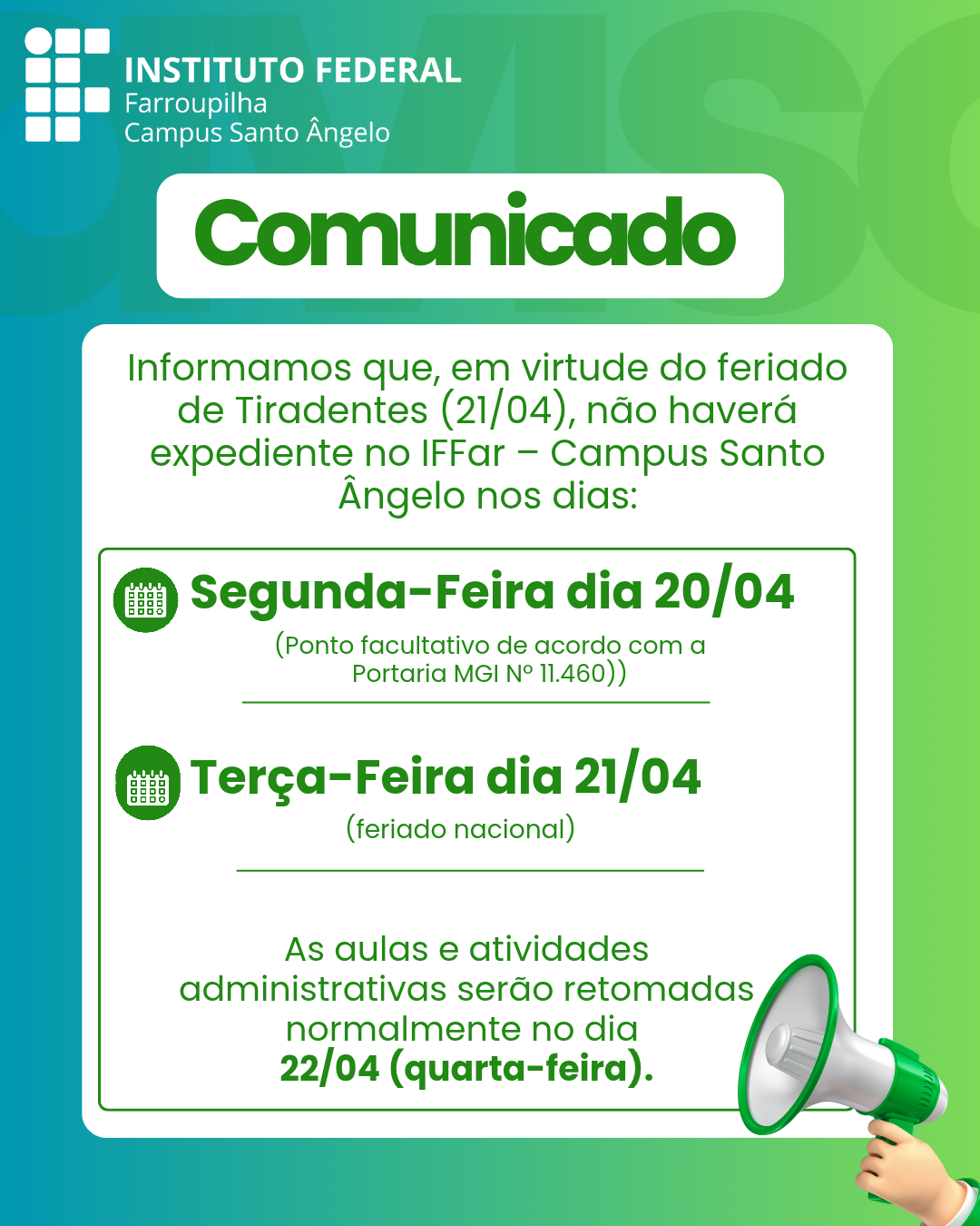 O Instituto Federal Farroupilha – campus Santo Ângelo (IFFar-SAn) informa que, em virtude do feriado de Tiradentes (21 de abril), não haverá expediente nos seguintes dias: