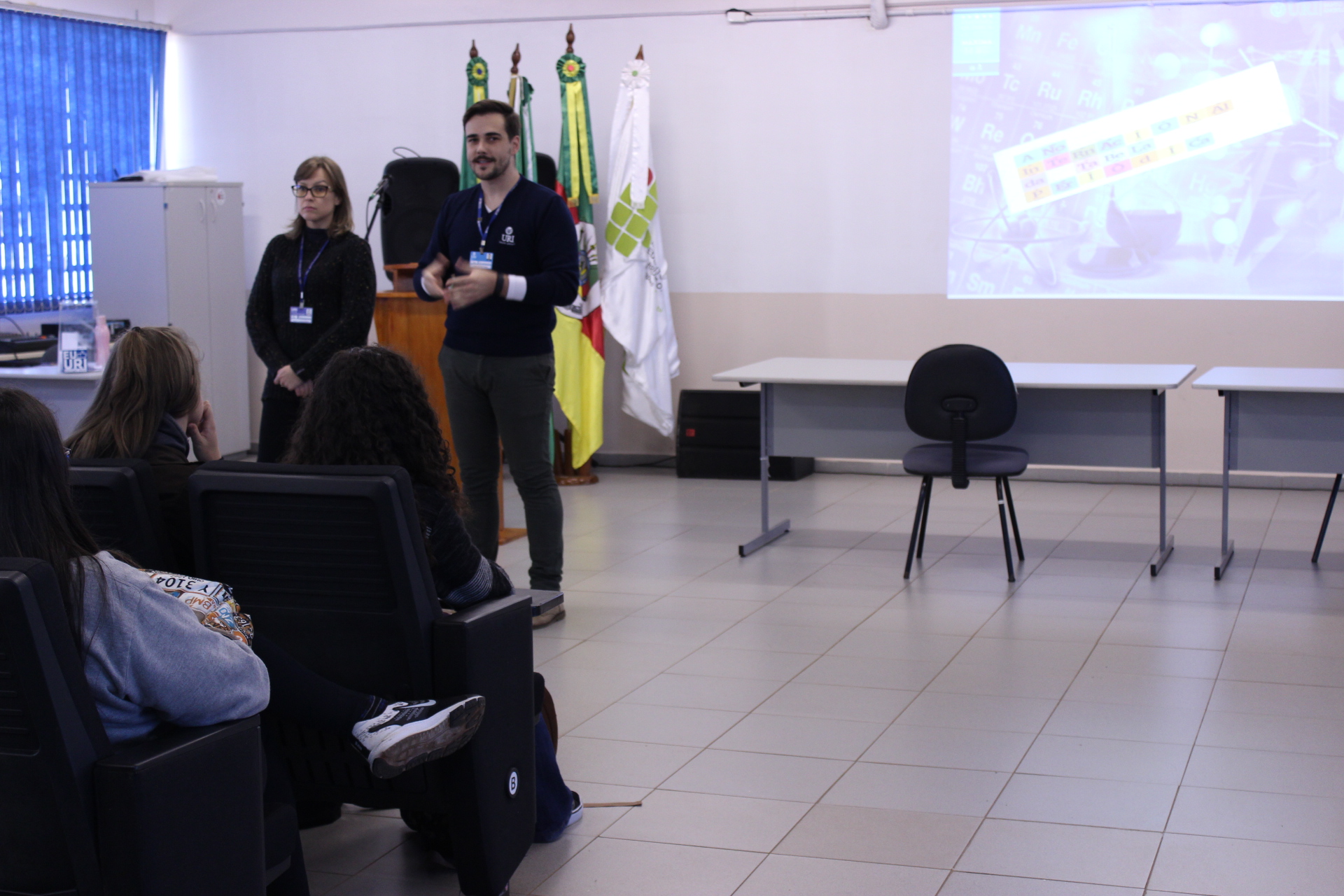 Na tarde de quinta, 27/06, o IFFar – Campus Panambi recebeu os professores Juliane de Moura e Isaac Nunes, do Curso de Engenharia Química da URI Santo Ângelo, para falar sobre a tabela periódica e também sobre a relevância dos elementos e processos químicos em nosso cotidiano.
