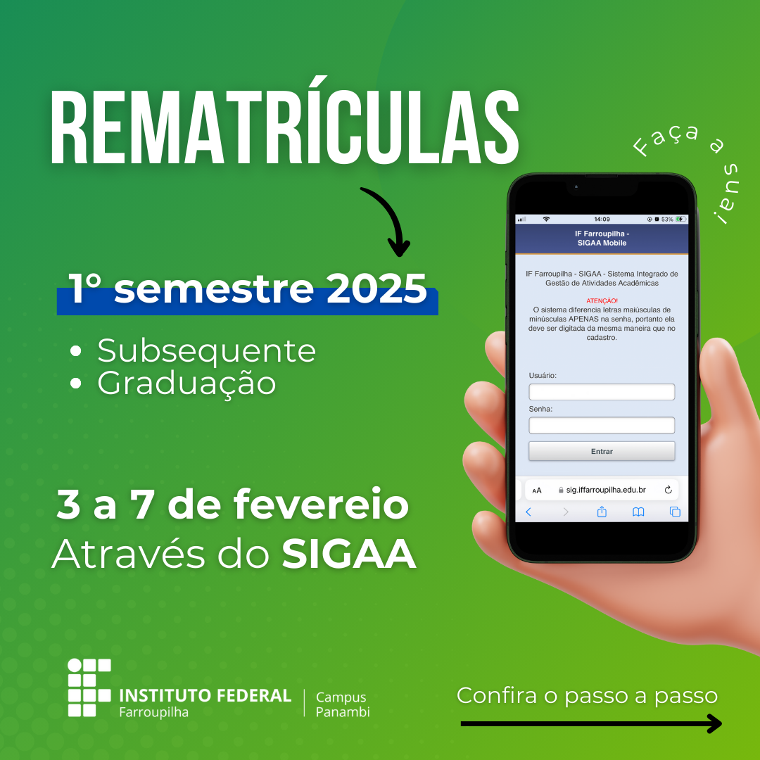 O IFFar – Campus Panambi informa que o período de rematrícula para estudantes dos cursos de Graduação e Subsequentes ocorrerá entre os dias 3 e 7 de fevereiro de 2025.