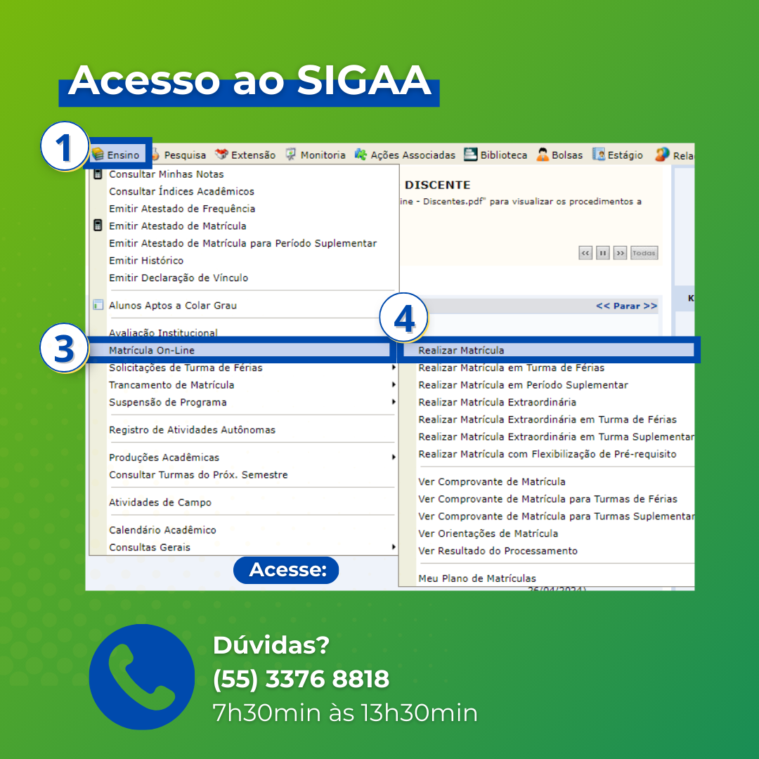 A seleção de disciplinas deverá ser realizada por meio do Portal do Aluno no SIGAA (https://sig.iffarroupilha.edu.br/sigaa), utilizando o CPF (sem pontos ou traços) como login.