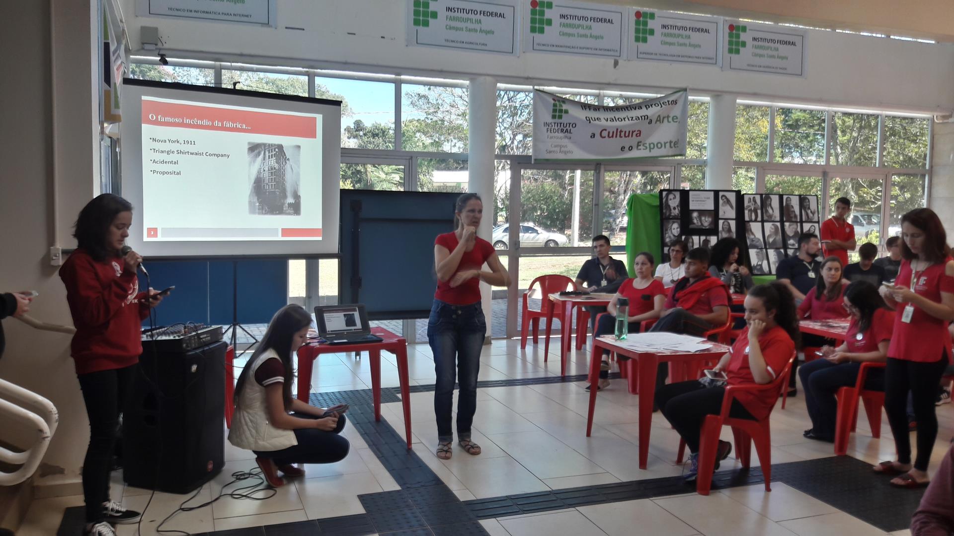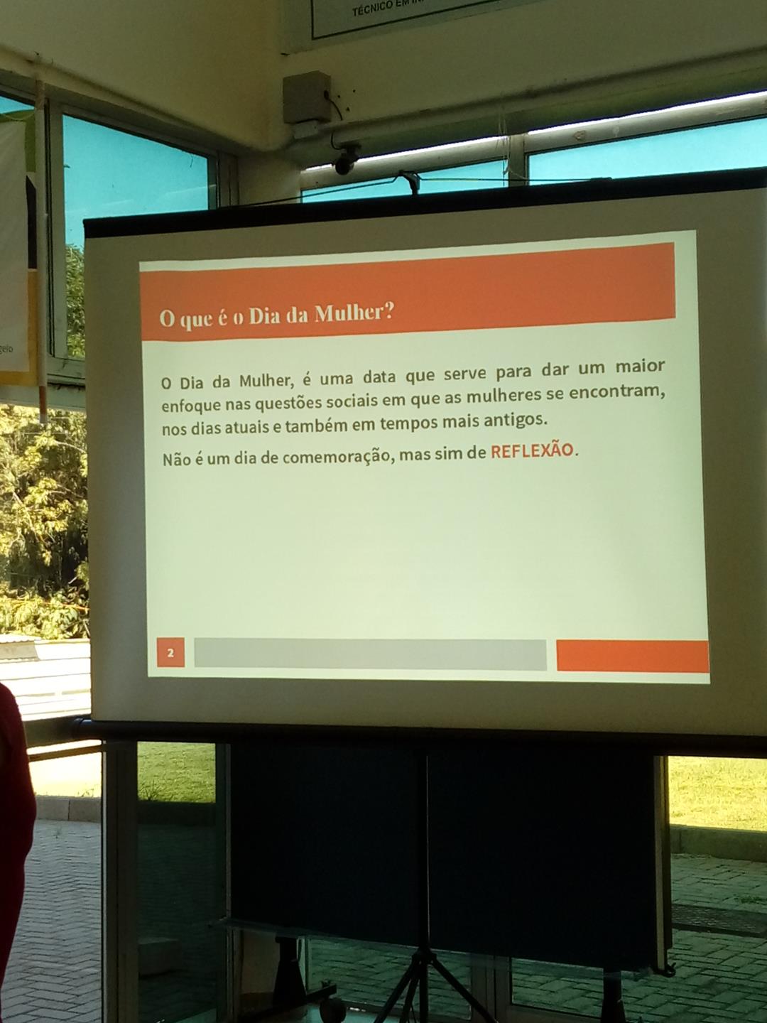 Os estudantes do Grêmio Estudantil participaram da atividade trazendo uma narrativa dos motivos da instituição do dia 8 de março como Dia Internacional da Mulher, contextualizando a história de luta pelos direitos femininos. Após essa narrativa, destacaram a história de algumas mulheres que foram significativas nas artes, ciência, literatura, etc. Por fim apresentaram um vídeo homenageando as mulheres.