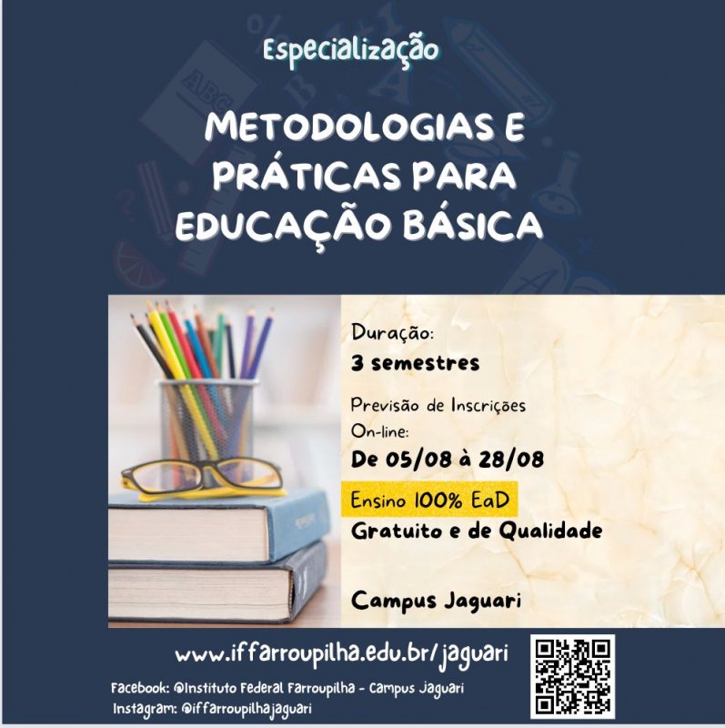 Foram aprovados no dia 14/07, em reunião do CONSUP, os Cursos de Especialização Gestão Escolar EaD e Especialização Metodologias e Práticas para Educação Básica EaD. Com duração de 3 semestres, sendo ofertados na modalidade Ead, 100% gratuito pelo IFFar Campus Jaguari.