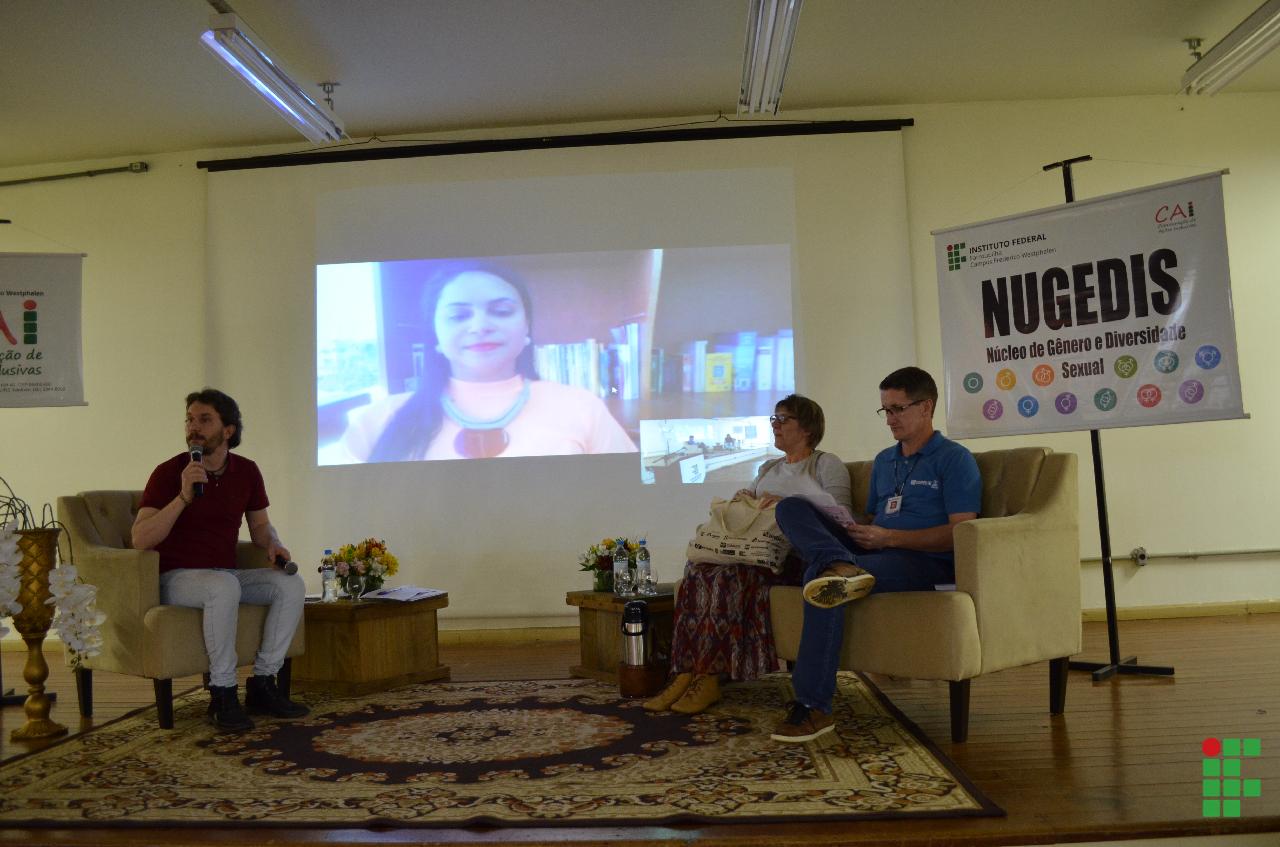 Para o momento de debate, após a exibição do curta, o Professor do IFFar/FW William Nunes foi convidado para executar a mediação, ao lado dos(as) convidados(as) a Advogada Amanda Rodrigues, o extensionista rural da ASCAR/EMATER-RS Flavio Vogt e Salete Maglia, a qual atua em projetos de extensão com mulheres rurais por meio do CETAP, é membra da diretoria da ADMAU e participa do coletivo feminista Maria Frederica.