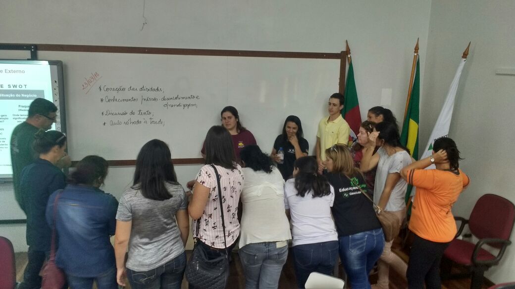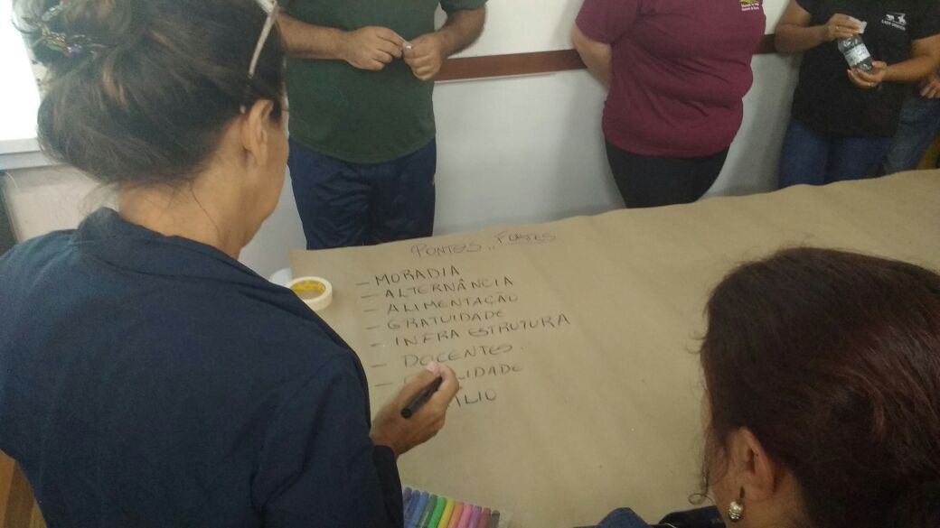 Dentre as várias sugestões do grupo, destaca-se a inserção da cooperação e da qualidade como valores da instituição. No que diz respeito aos pontos fortes, mencionou-se a estrutura física, a qualificação dos servidores e a transparência da gestão – que corrobora para a construção de uma imagem positiva do IFFar. Em relação às fraquezas, o grupo apontou a carência de estrutura para aulas práticas de alguns cursos. As oportunidades da instituição, segundo os participantes, estão relacionadas à incubação de ideias inovadoras e da implantação de um parque tecnológico. Já as ameaças referem-se a falta de alunos, a evasão e a pouca divulgação em municípios da região.