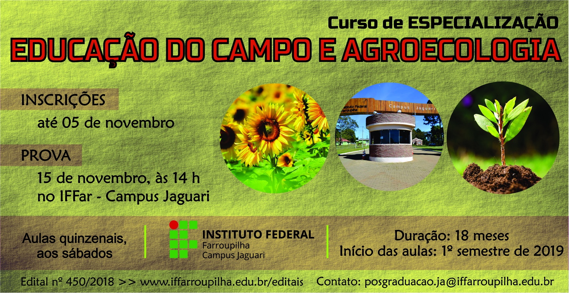 De 14 a 30 de outubro estarão abertas as inscrições para o Curso de Pós-Graduação Lato Sensu - Especialização em Educação do Campo e Agroecologia do IFFar - Campus Jaguari.