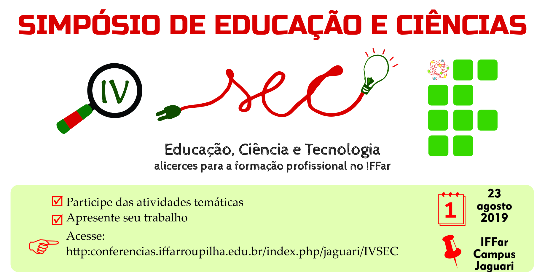 O SIMPÓSIO DE EDUCAÇÃO E CIÊNCIAS (SEC) é um evento promovido pelo IFFar Campus Jaguari e definido no calendário escolar. O evento é aberto ao público interno e externo e contempla pesquisadores, estudantes, docentes e técnicos administrativos das diferentes áreas do conhecimento.