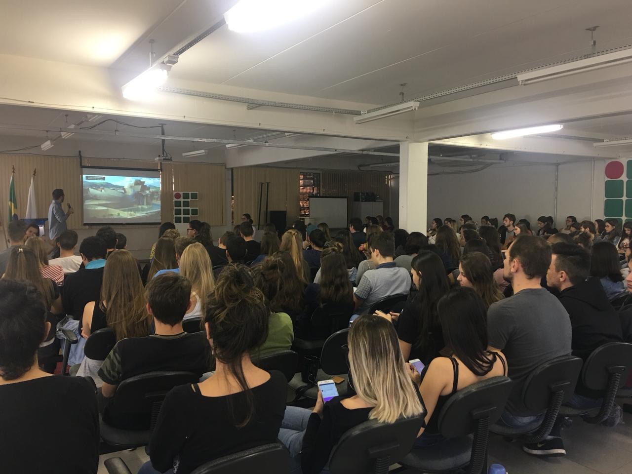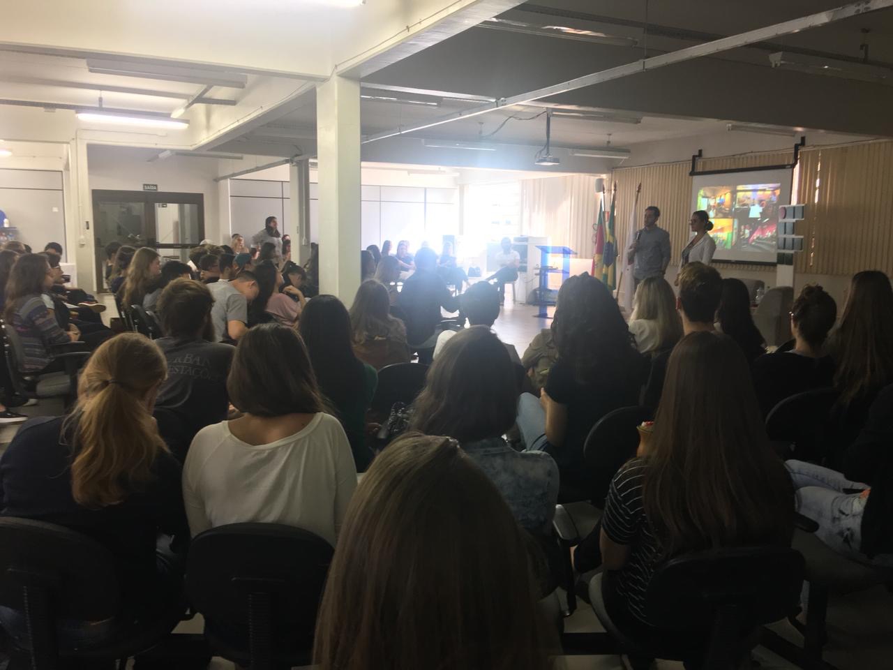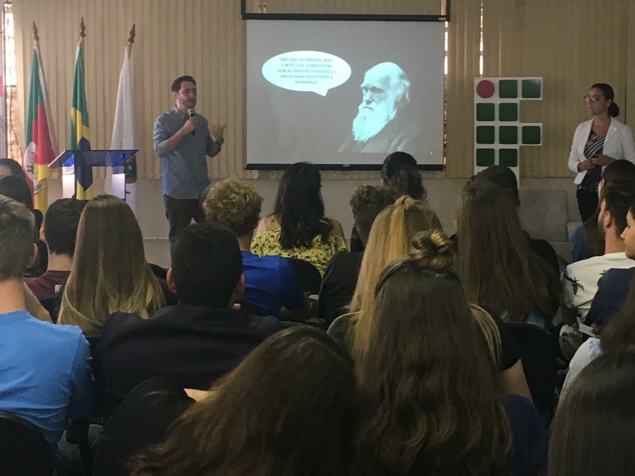 A aula, promovida no auditório, teve como tema elementos que podem inspirar um bom projeto, com o arquiteto Eduardo Beltrame e a designer Rocheli Rockenbach, da EVLO Arquitetura e Urbanismo, empresa localizada em Santa Rosa. Os palestrantes falaram sobre suas experiências profissionais como empreendedores, mostraram alguns projetos executados na região e relataram algumas complexidades da profissão. “Todo trabalho é um desafio, tem a parte divertida que é criar, e também a parte mais intrincada, que é convencer o cliente de que, muitas vezes, a ideia dele não é a melhor”, disse Eduardo. Ao ser questionada sobre o mercado de trabalho em Santa Rosa, Rocheli falou que não tem dificuldades em encontrar materiais ou profissionais na região para a execução dos projetos e ressaltou que “Santa Rosa tem clientes com mente aberta para ousar e arriscar.”