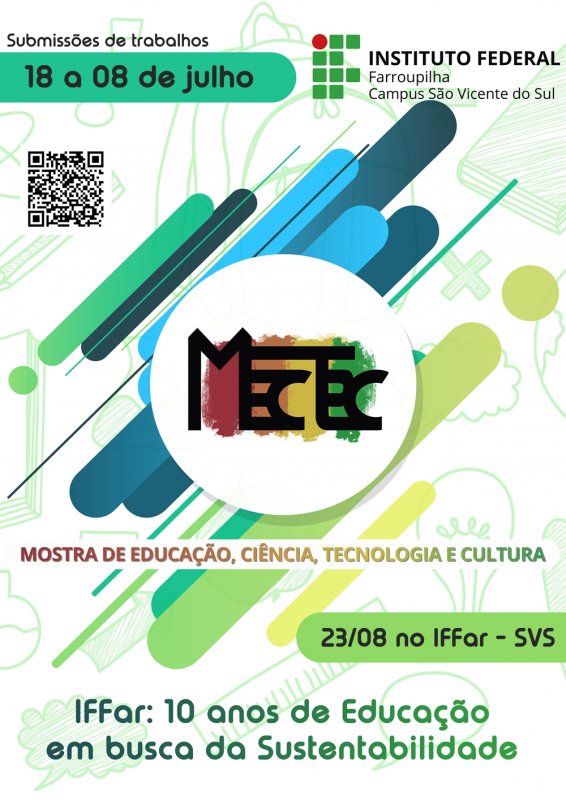 O prazo para submissão de trabalhos para a Mostra de Educação, Ciência e Tecnologia (MECTeC) do Campus São Vicente do Sul vai até dia 8 de julho. O Regulamento do evento pode ser encontrado no site oficial, onde também poderão ser realizadas as inscrições para o evento. As modalidades de participação são: ouvinte, apresentação oral, em pôster e artístico-cultural.