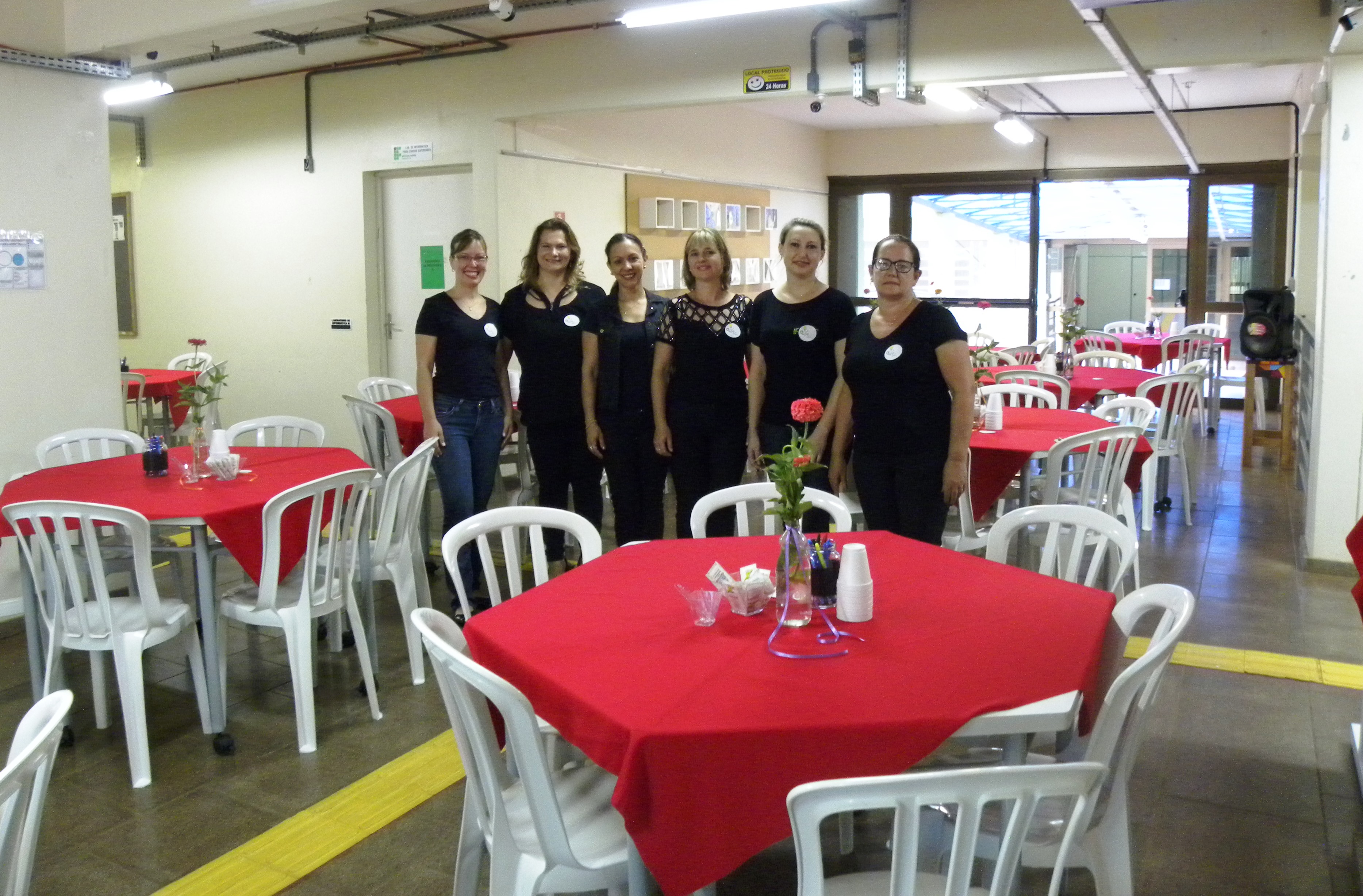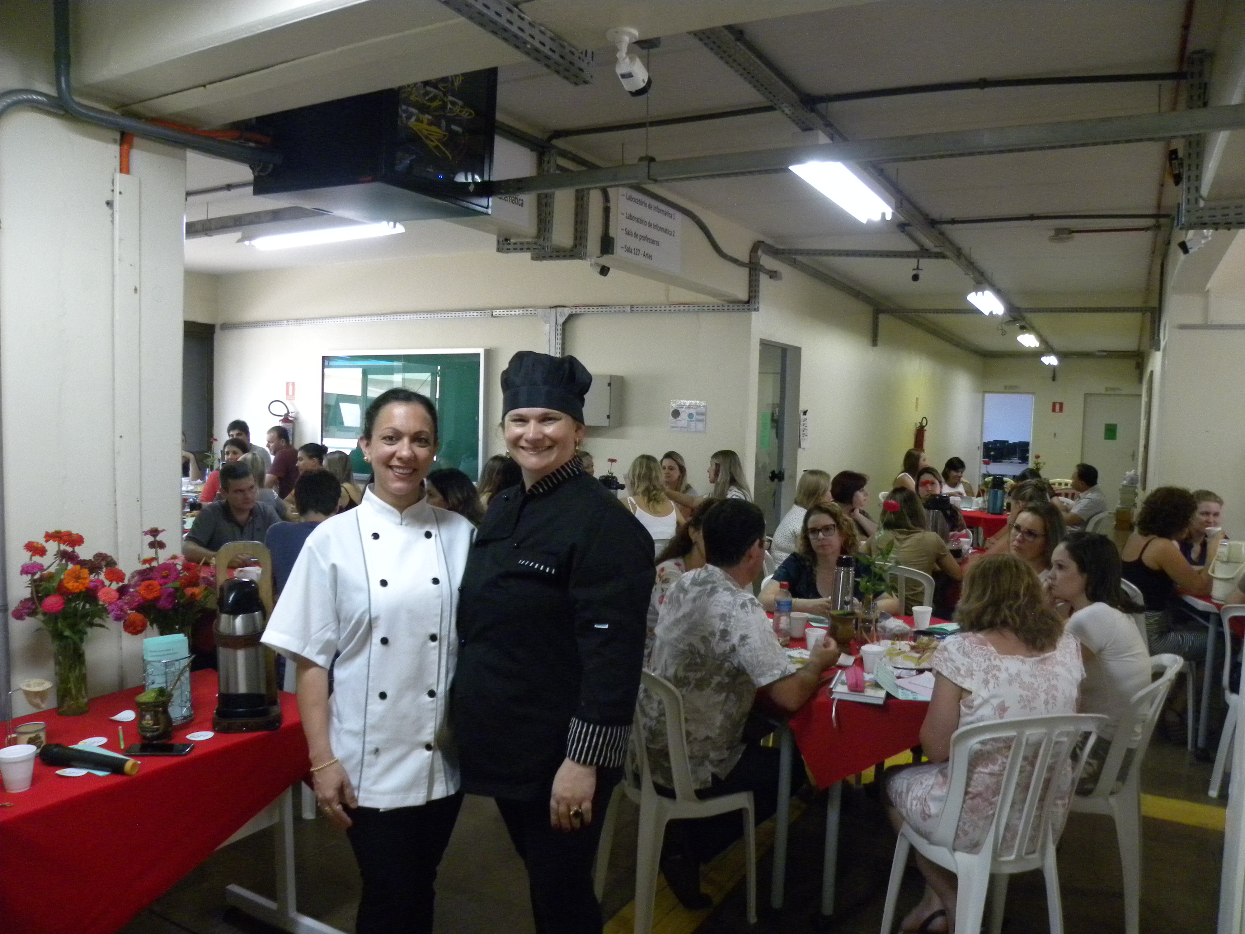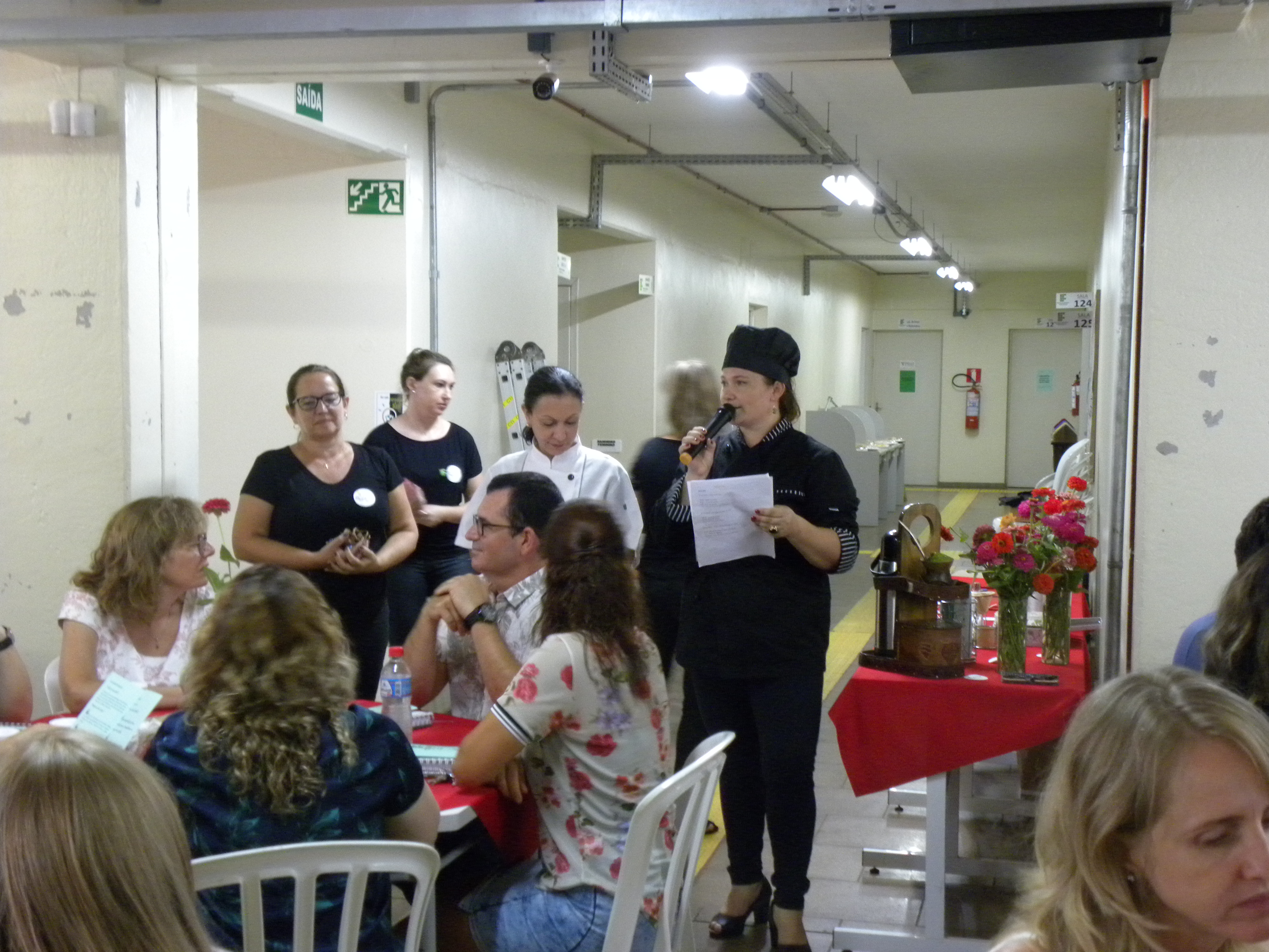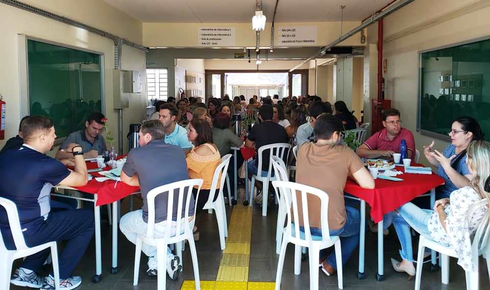 Na manhã da segunda-feira (11), a dinâmica realizada foi o “World Café”, uma técnica utilizada com o objetivo de potencializar diálogos e viabilizar a construção coletiva de proposições em torno do tema Ensino Médio Integrado. Para isso, uma cafeteria fictícia foi montada no corredor do prédio Pedagógico 1, tendo a diretora de Ensino, Analice Marchezan, e a coordenadora de Ensino, Raquel Ghellar Canova, caracterizadas como chefes de cozinha.
