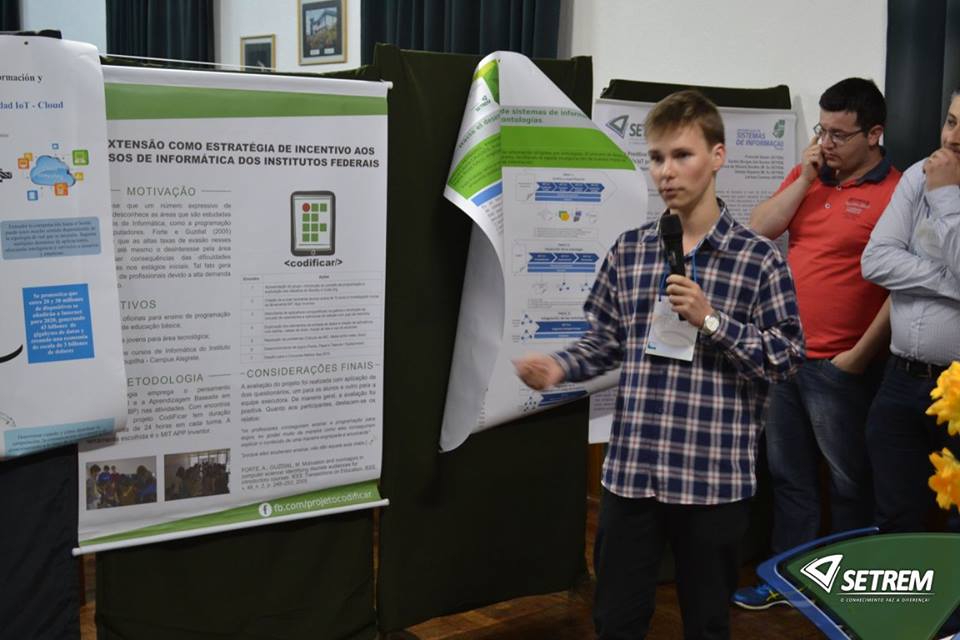 O aluno Rudieri Bauer, que cursa o 3º semestre de ADS, apresentou o trabalho intitulado "A Extensão como Estratégia de Incentivo aos Cursos de Informática dos Institutos Federais", sob orientação da Prof.ª Jaline Mombach, durante o VII STIN e V SABTIC. Esse trabalho relata a experiência do projeto de extensão codIFic@r. Os eventos foram realizados na Sociedade Educacional Três de Maio.