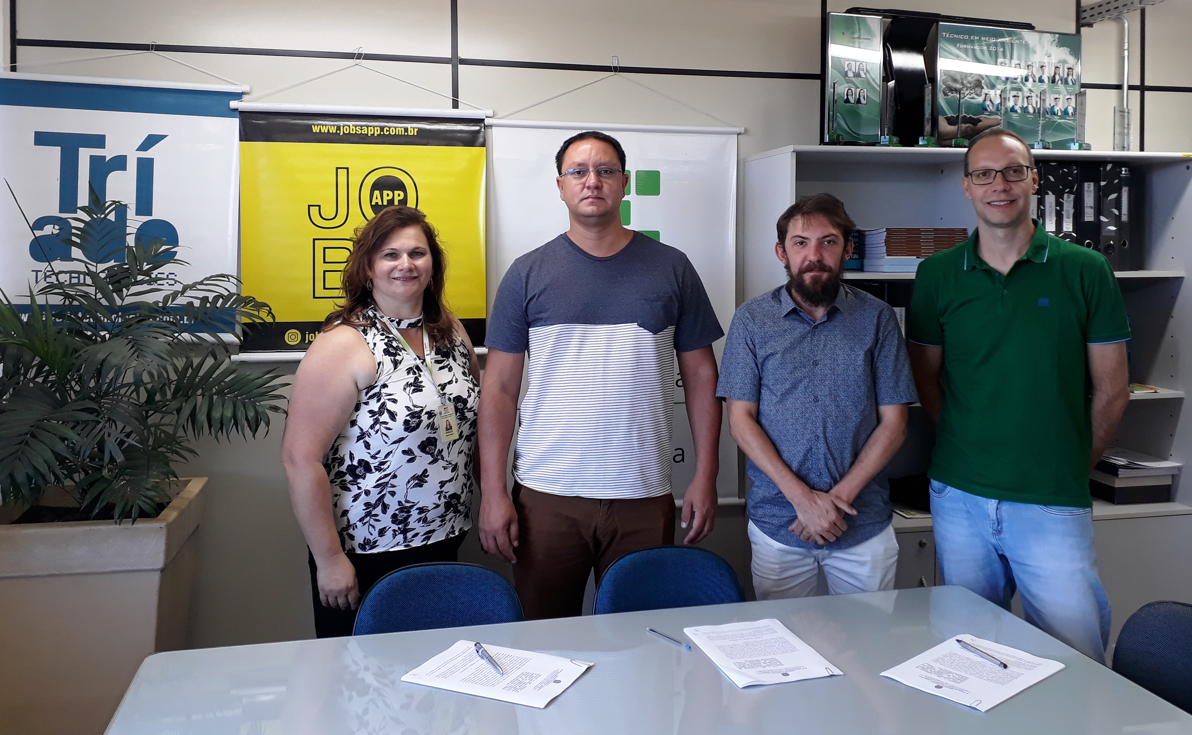 Participaram da reunião de formalização da assinatura do contrato, realizada no gabinete da direção, a diretora-geral substituta, professora Analice Marchezan; o coordenador do Núcleo de Inovação Tecnológica – NIT, professor Rodrigo Soder; e os representantes da empresa Triade Technologies, Ricardo Cademartori e Ike Becker. A empresa tem como produto principal o JobsApp, uma plataforma digital para quem procura ou oferta serviços, como encanador, mecânico, eletricista, pedreiro, dog-walker, costureiro, limpador de piscina e etc.