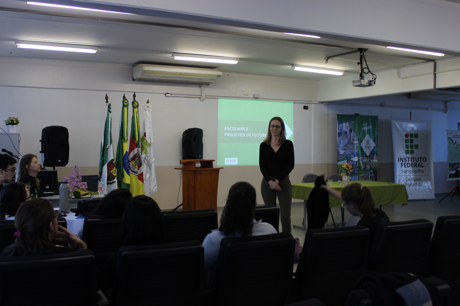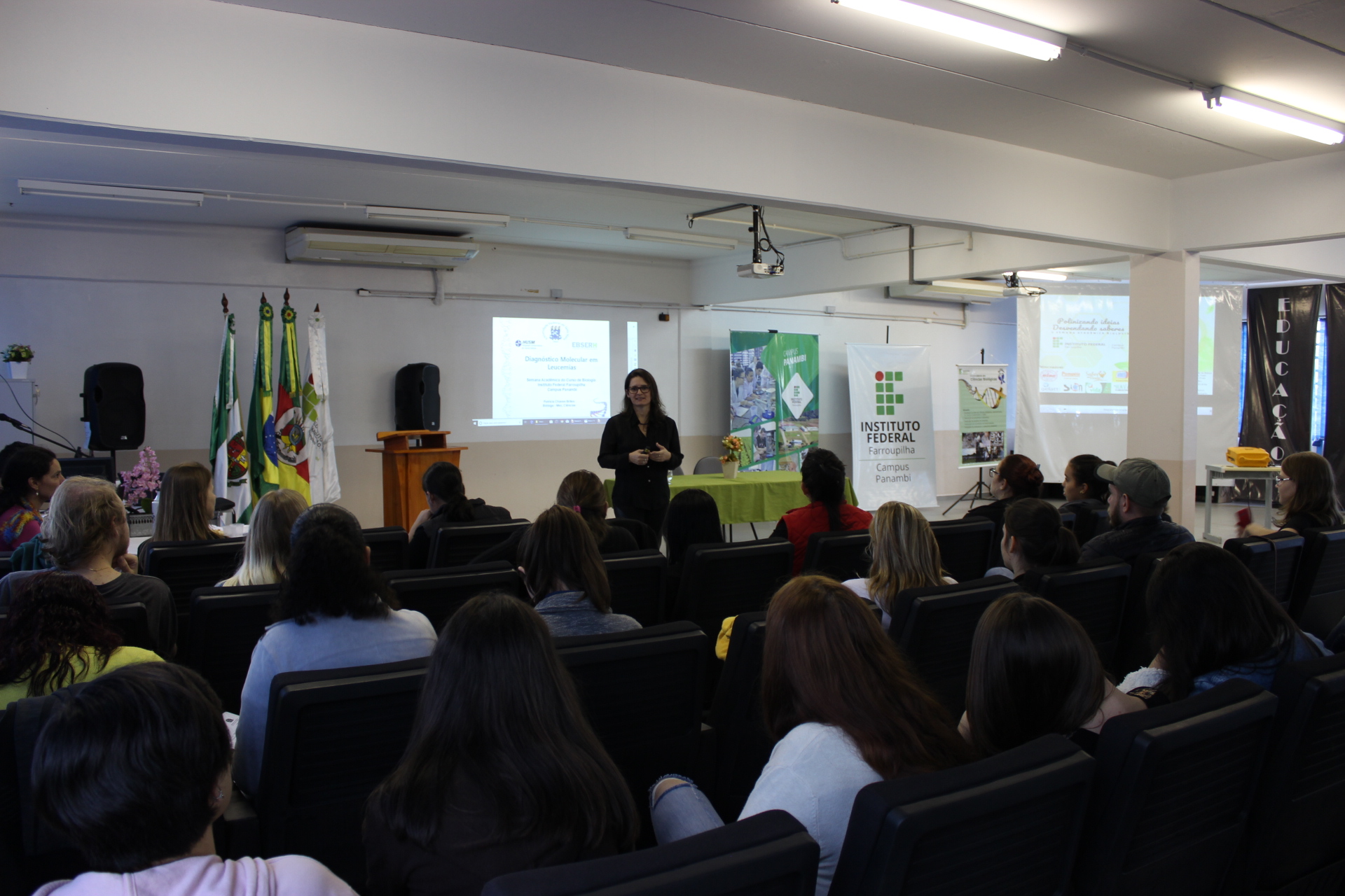 A segunda atividade da manhã foi uma palestra presencial com o farmacologista Gilvani Alves Martins, sobre o tema “Medicamentos alopáticos, fitoterápicos e interação medicamentosa”, realizada no auditório do IFFar – Campus Panambi.