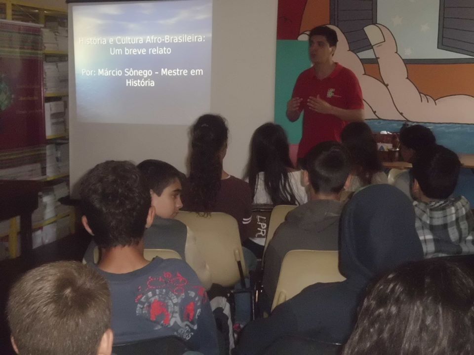 Na oportunidade, Márcio falou sobre a temática afro-brasileira, fruto de suas pesquisas, para os alunos do 4º, 5º e 7º ano, além de seus professores.