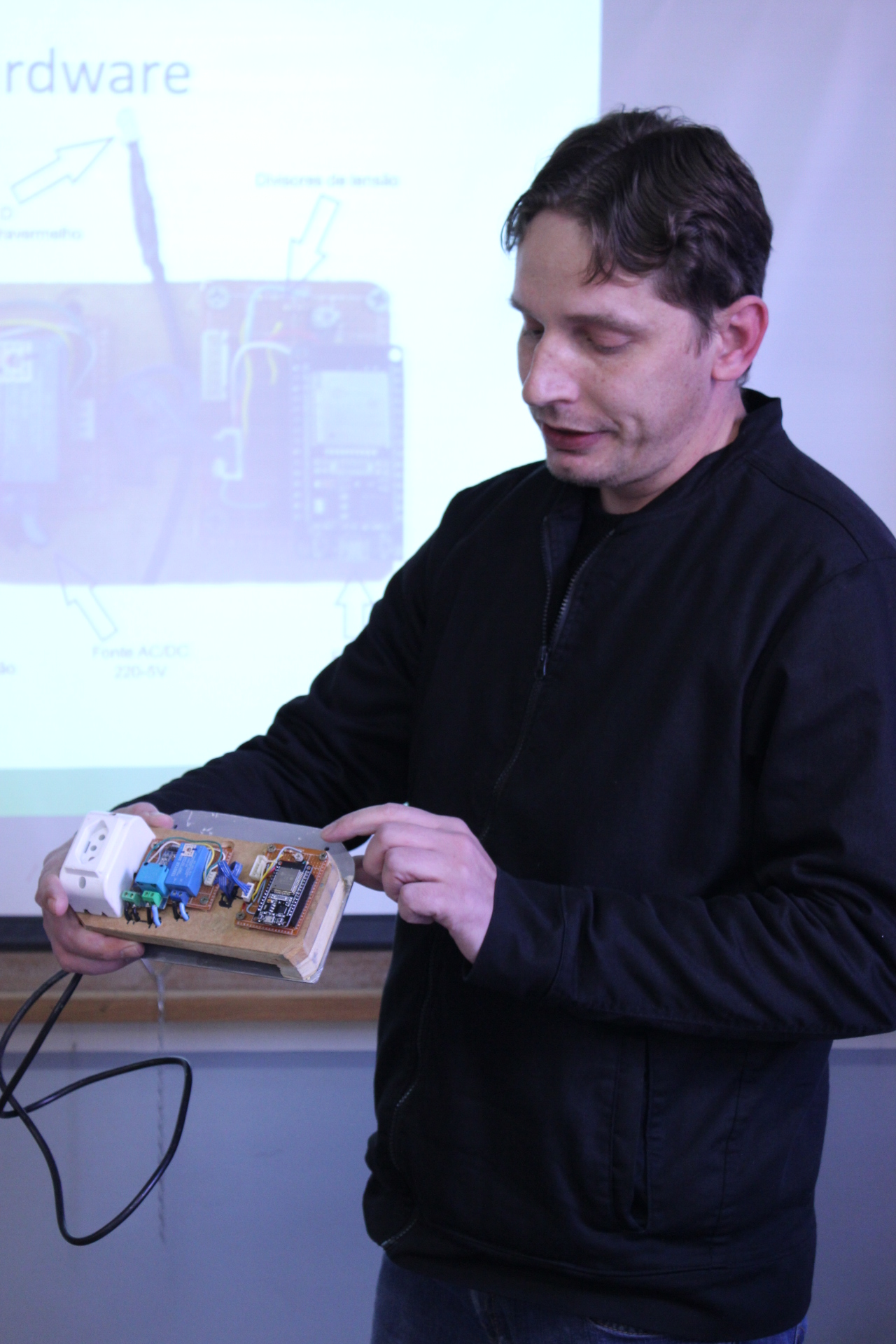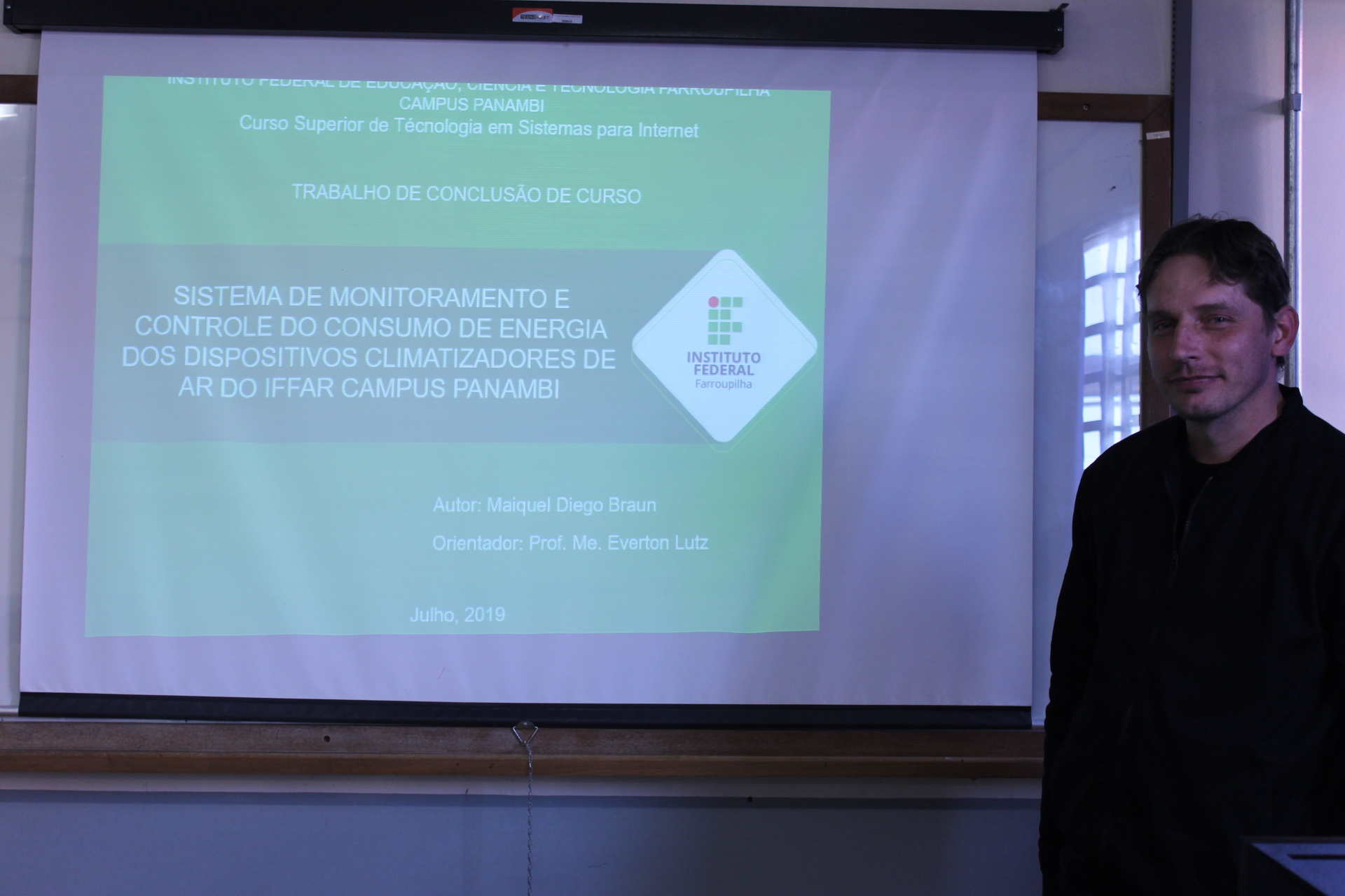 >>> Sistema de monitoramento e controle do consumo de energia dos climatizadores de ar do Campus Panambi: desenvolvido por Maiquel Braun, o trabalho consistiu na criação de um protótipo a ser instalado nos equipamentos de ar condicionado que permite monitor o consumo energético de cada dispositivo e também controlá-lo remotamente, por meio de um sistema que pode ser acessado por celular ou computador.