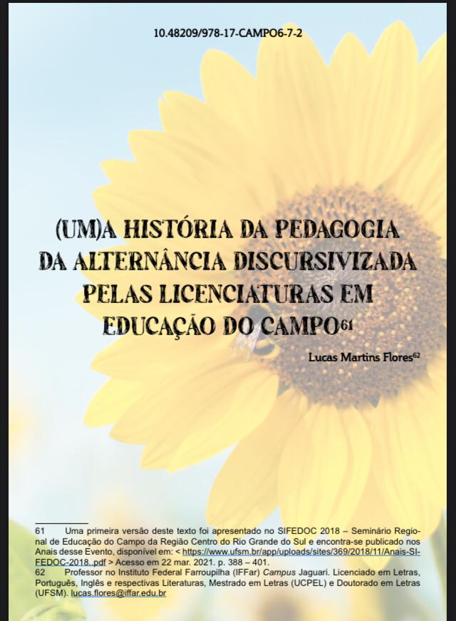 O professor Lucas Martins Flores, do Campus Jaguari do Instituto Federal Farroupilha, participa da obra com o capítulo “(Um)a história da Pedagogia da Alternância discursivizada pelas Licenciaturas em Educação do Campo”. Nesse texto, o professor reflete sobre (um)a história possível da Pedagogia da Alternância por meio da leitura e interpretação de Projetos Pedagógicos de Cursos de Licenciaturas em Educação do Campo.