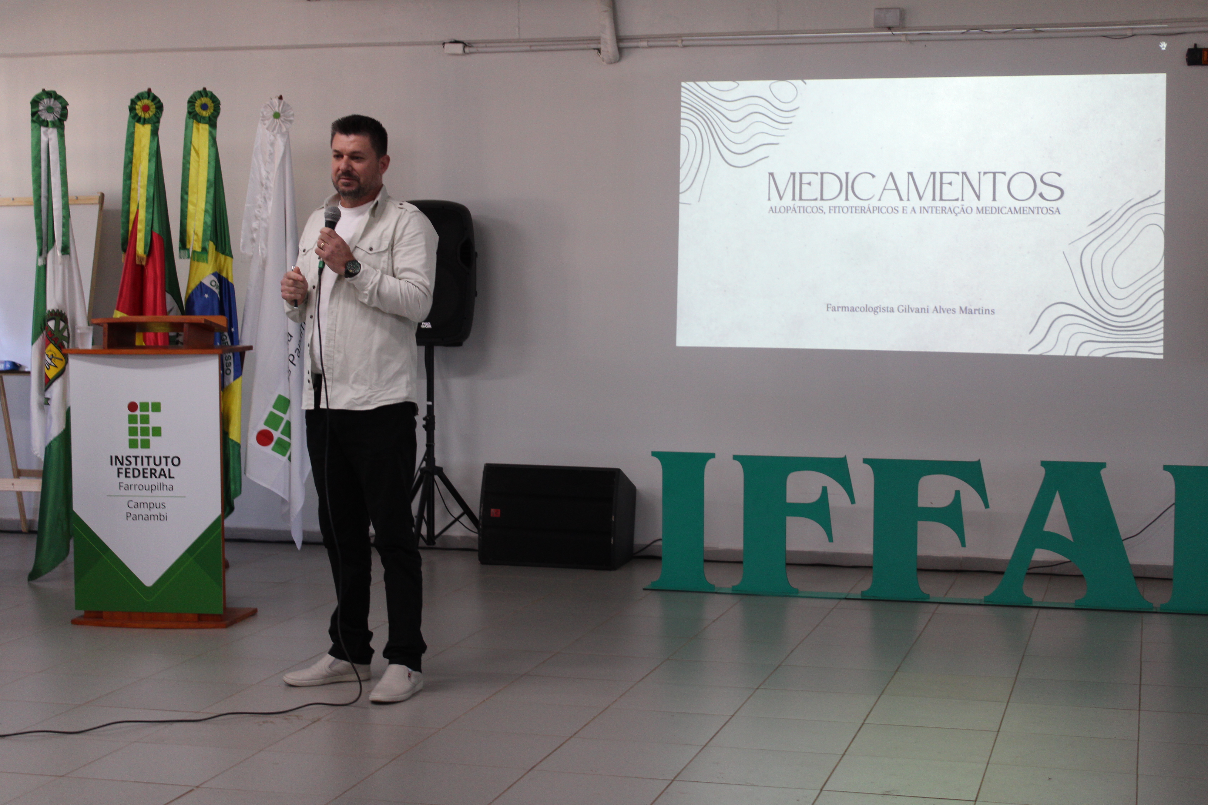 A segunda atividade da manhã foi uma palestra presencial com o farmacologista Gilvani Alves Martins, sobre o tema “Medicamentos alopáticos, fitoterápicos e interação medicamentosa”, realizada no auditório do IFFar – Campus Panambi.