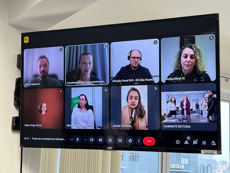 O ato ocorreu em formato híbrido, com participações presenciais e remotas. Estiveram presentes na Reitoria, a professora Nídia Heringer, o novo servidor, professor Thiago Luiz de Oliveira Cabral, e a diretora de Gestão de Pessoas, Daiana de Freitas Carpenedo. De forma remota, participaram a nova servidora, professora Claudia Piva, o diretor de Ensino do Campus São Borja, professor Alexsandro Lencina, e a diretora substituta de Gestão de Pessoas, Cristiane Guerch Atarão.