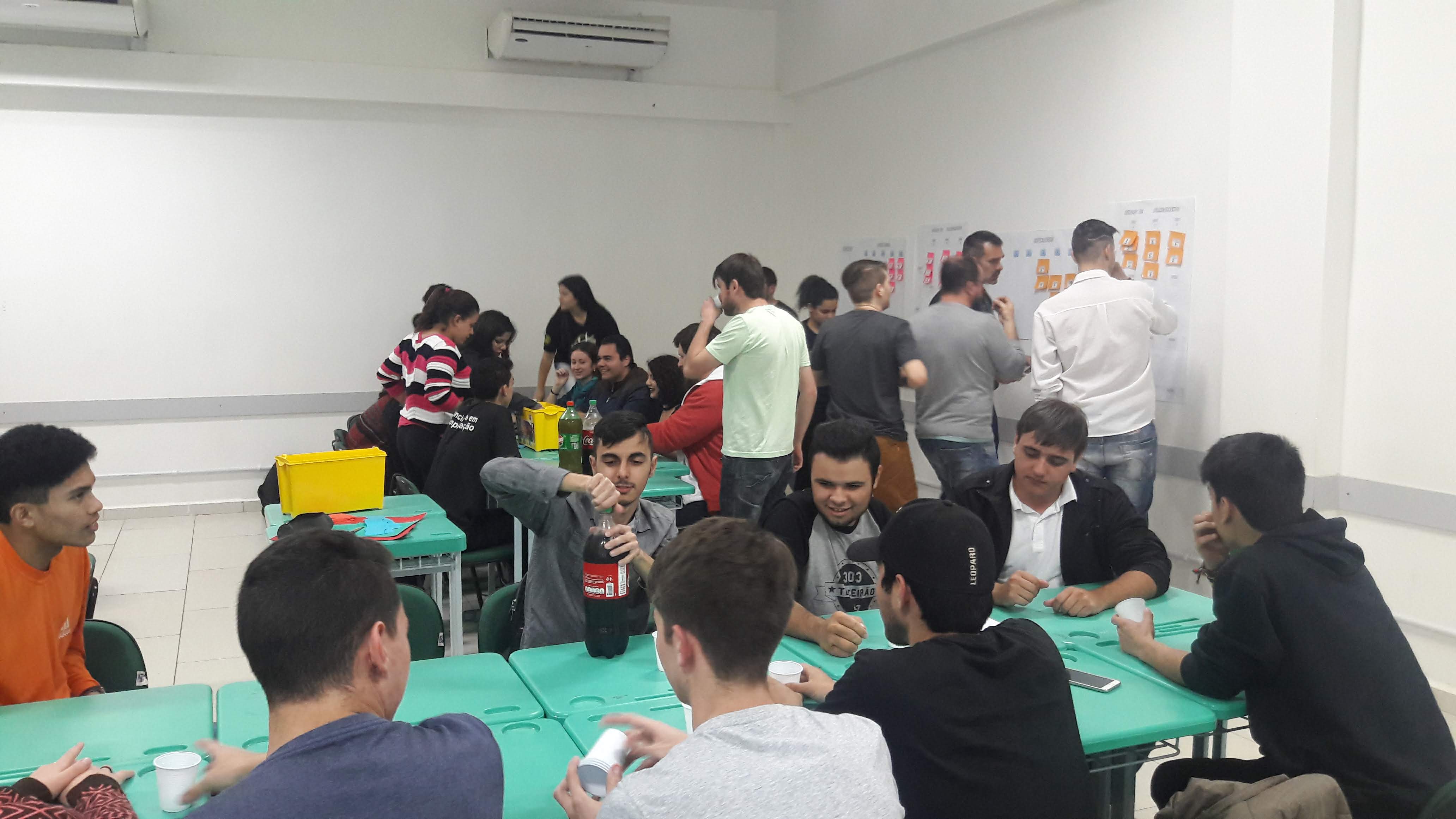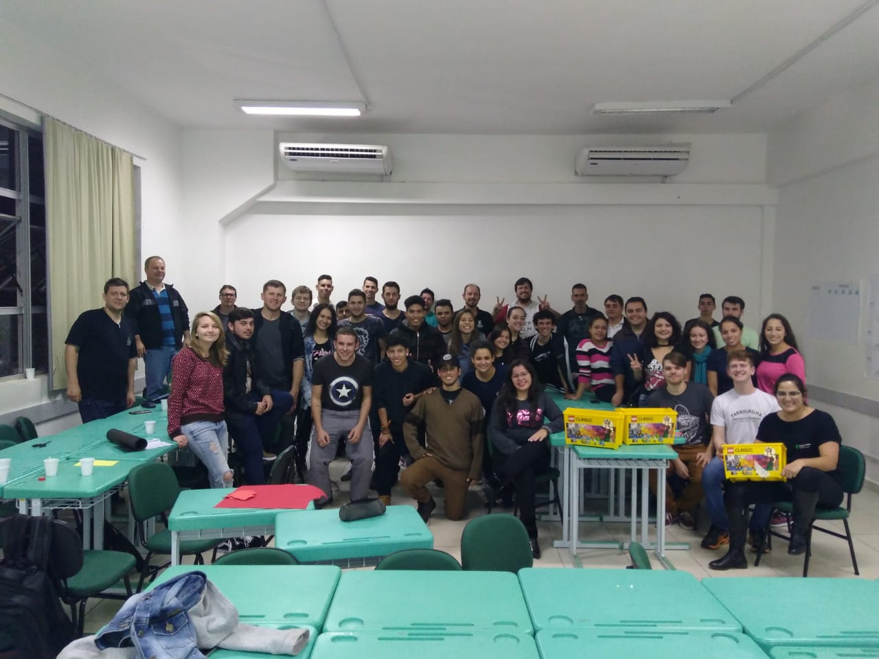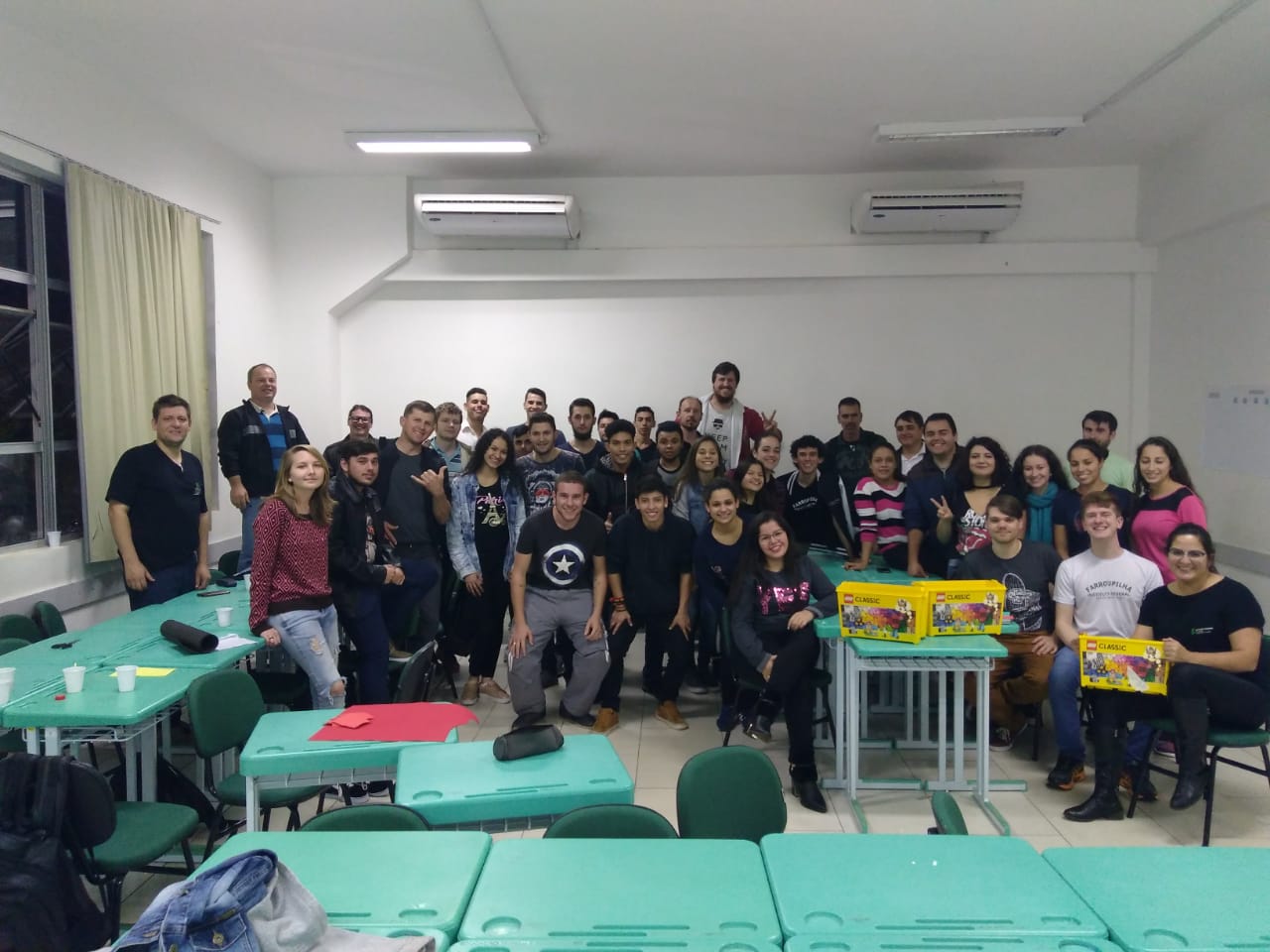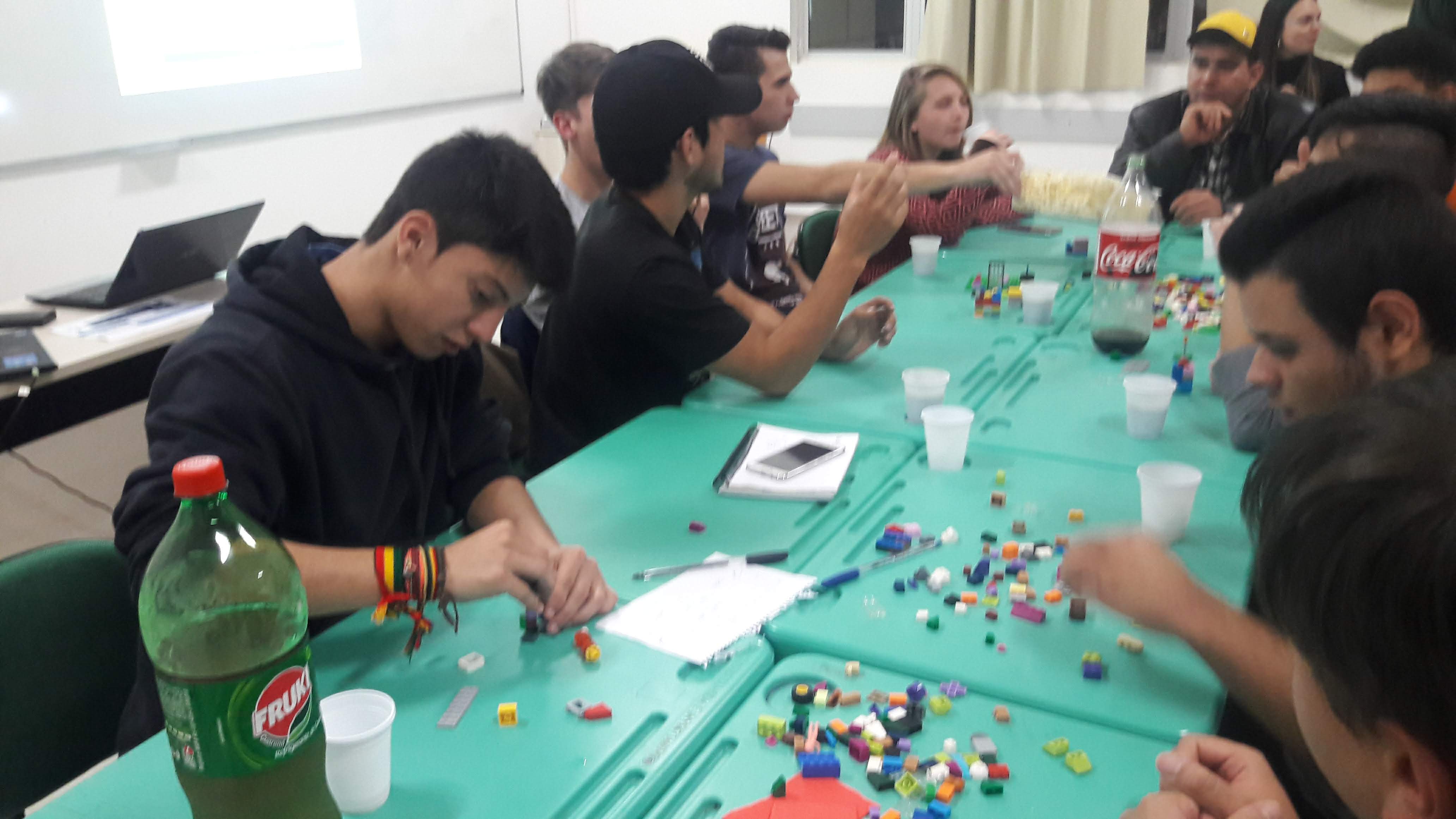 Por fim, na quinta-feira dia 21, os acadêmicos participaram da Oficina de Lego4Scrum: gerenciando equipes e projetos com metodologias ágeis, sob o comando da prof.ª Karlise Soares Nascimento e dos acadêmicos Anderson Daniel Stochero, Samuel Müller Forrati, Lidiane Torres Vieira e Veridiane Torres Vieira. Foi uma noite de atividades totalmente práticas onde, visando trabalhar as Metodologias Ágeis de desenvolvimento de Projeto de Software, como o SCRUM, os oficineiros desafiaram os participantes a projetar e construir uma cidade, com peças de Lego. Durante cada etapa, as equipes tiveram que se organizar de maneira a colaborar entre si para superar as dificuldades e conseguir, ao final, cumprir os prazos e metas estipulados.