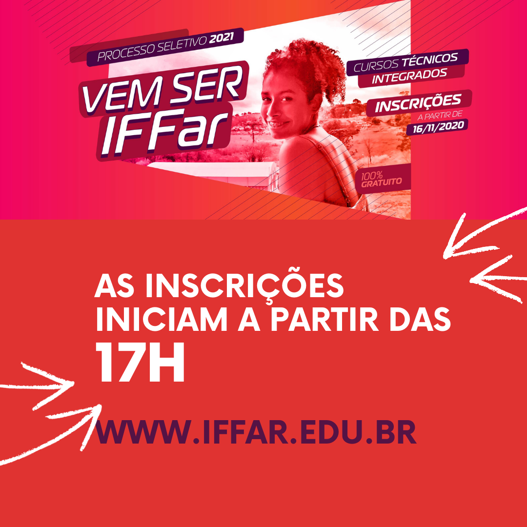 O período de inscrições para os cursos técnicos integrados ao Ensino Médio do IFFar, com ingresso no primeiro semestre de 2021, será de 16 de novembro (a partir das 17h) a 23 de dezembro de 2020. As inscrições são gratuitas e devem ser realizadas de forma online. O endereço será divulgado no edital do processo seletivo.