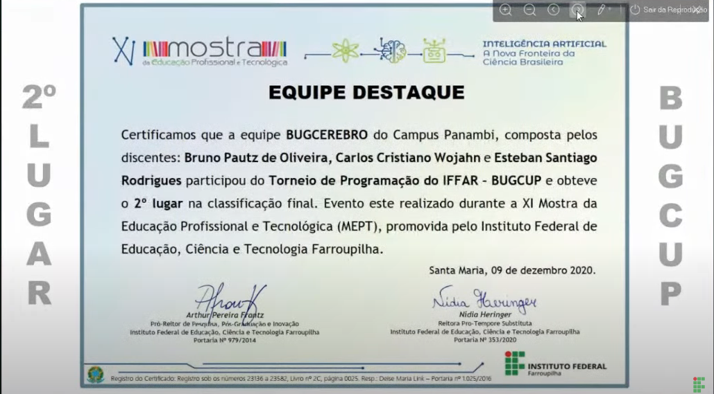 2º lugar - Equipe BUGCerebro, composta pelos acadêmicos de Tecnologia em Sistemas para Internet, Bruno Pautz de Oliveira, Carlos Cristiano Wojahn e Esteban Santiago Rodrigues. O acompanhamento e estímulo para participação da equipe no torneio esteve a cargo dos professores Leonardo Schmidt e Renan Lírio de Souza.