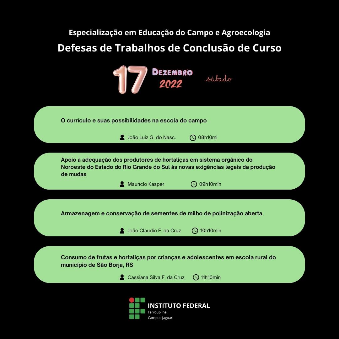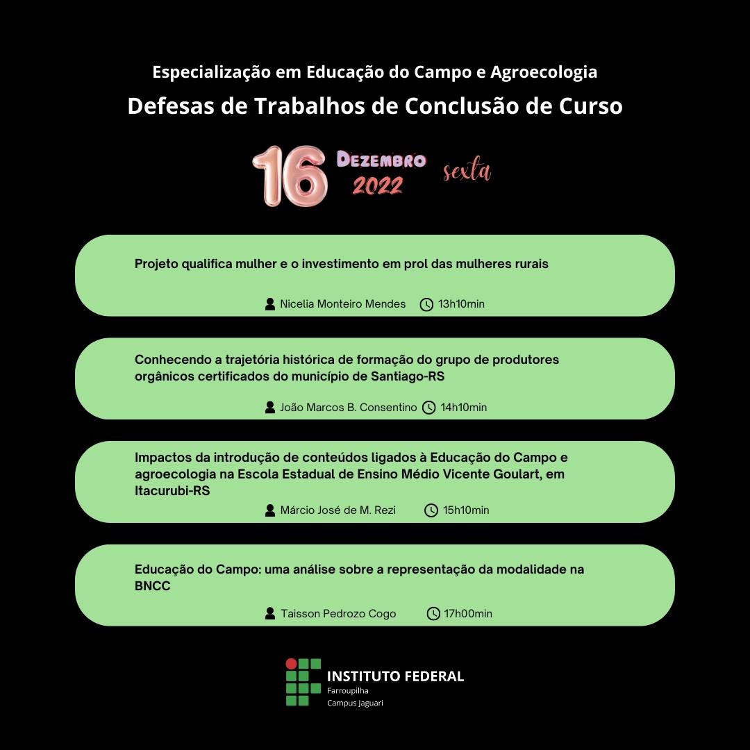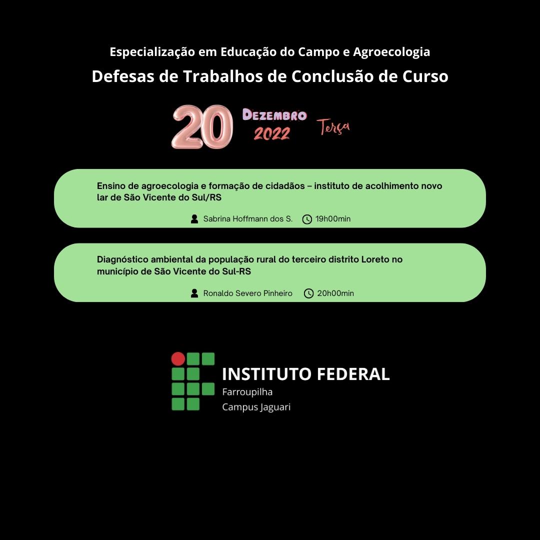 Entre os dias 15, 16, 17 e 20 de dezembro de 2022, ocorrem as defesas públicas de Trabalhos de Conclusão de Curso (TCC) da 6ª turma do curso de Especialização em Educação do Campo e Agroecologia do IFFar Campus Jaguari. Acompanhem!