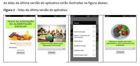 Este trabalho apresenta o produto educacional desenvolvido a partir de uma pesquisa-ação de caráter exploratório realizada no âmbito do Programa de Mestrado em Educação Profissional e Tecnológica – ProfEPT – Campus Jaguari, que investigou a gestão do Programa Nacional de Alimentação Escolar – PNAE no Instituto Federal Farroupilha. A partir dos resultados da pesquisa, foi desenvolvido um aplicativo para smartphone, na plataforma MIT App Inventor, para ser utilizado na aplicação dos testes de aceitabilidade da alimentação escolar, conforme prevê a legislação que rege o Programa. Concluiu-se que o aplicativo pode ser uma ferramenta muito útil e dinâmica na aplicação dos testes de aceitabilidade da alimentação escolar, facilitando o desenvolvimento desta ação e pode contribuir para aumentar o interesse dos alunos no tema educação alimentar e nutricional no contexto escolar.