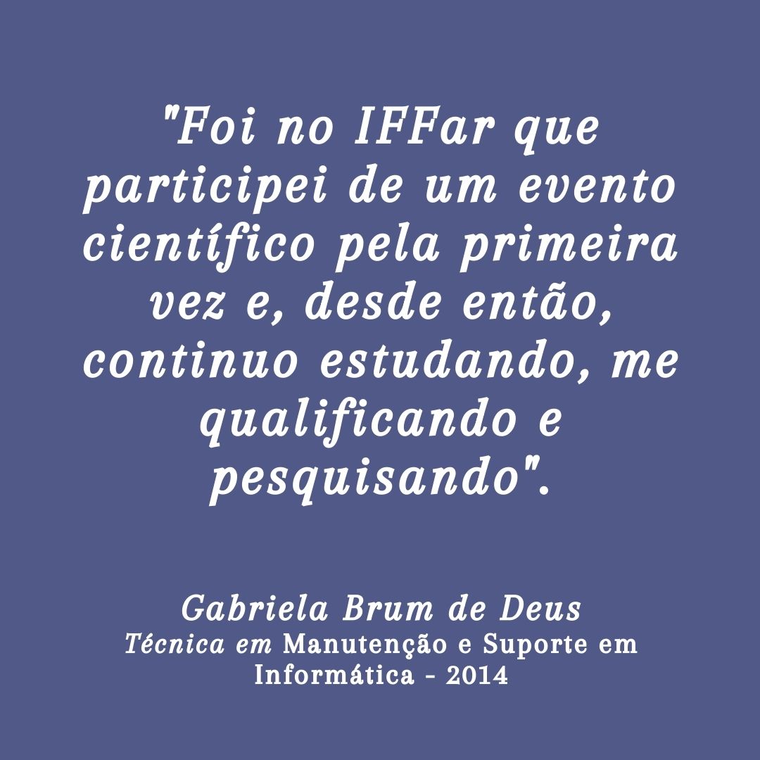 Foi no IFFar que participei de um evento científico pela primeira vez e, desde então, continuo estudando, me qualificando e pesquisando. E, como estudante-atleta vivi grandes momentos que, sem dúvidas, motivaram a escolha da minha carreira profissional.