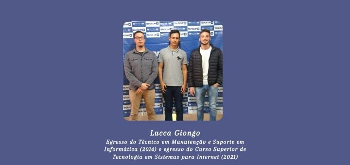 Hoje é dia de contar a história do Lucca Giongo, egresso do Técnico em Manutenção e Suporte em Informática (Ensino Médio) e egresso de Tecnologia em Sistemas para Internet (Ensino Superior).