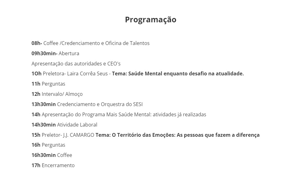 O evento será composto por diversas atividades, com destaque para as falas de Laira Corrêa Seus, executiva de Recursos Humanos de multinacionais de serviços e indústrias; e J.J. Camargo, médico, escritor e palestrante gaúcho. A atividade é mais uma ação que visa fomentar e ampliar o debate sobre a temática da Saúde Mental, contribuindo para o fortalecimento da rede de saúde, bem-estar e a prevenção de transtornos mentais e comportamentais junto à população.