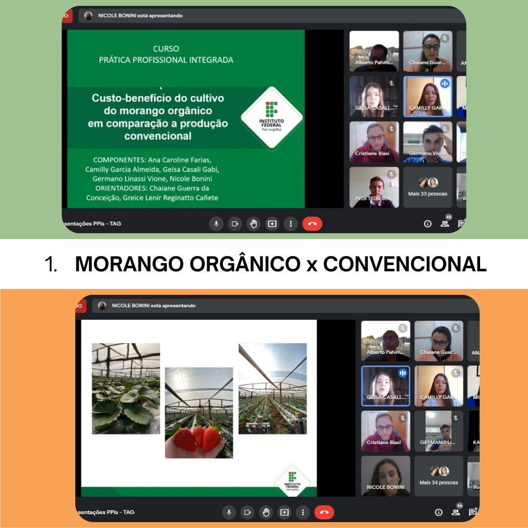 - O custo-benefício da produção de morango orgânico em comparação ao morango cultivado no sistema convencional está sendo estudado por um quarto grupo de alunos. A pesquisa irá comparar os custos e benefícios da produção do morango orgânico em relação ao seu cultivo convencional. Além disso, levantar com alguns produtores da região se a produção orgânica de morangos é economicamente viável para uma propriedade média a grande.