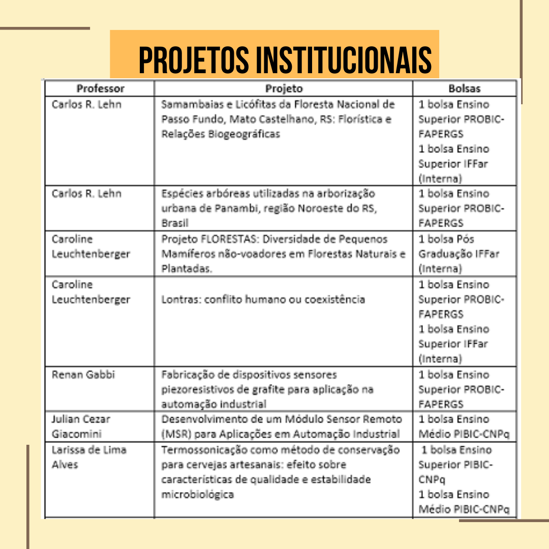 O IFFar – Campus Panambi dispõe de duas vagas em bolsas de pesquisa para discentes do curso de Licenciatura em Ciências Biológicas. As vagas são para atuação nos projetos contemplados pelo Programa Institucional de Bolsas de Iniciação Científica e Tecnológica do Instituto Federal Farroupilha.