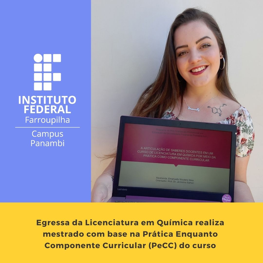 Recentemente a egressa do curso de Licenciatura em Química do IFFar – Campus Panambi, Emanuelly Wouters Silva, defendeu sua dissertação no programa de Mestrado Profissional em Educação na Universidade Federal da Fronteira Sul - Campus Erechim.