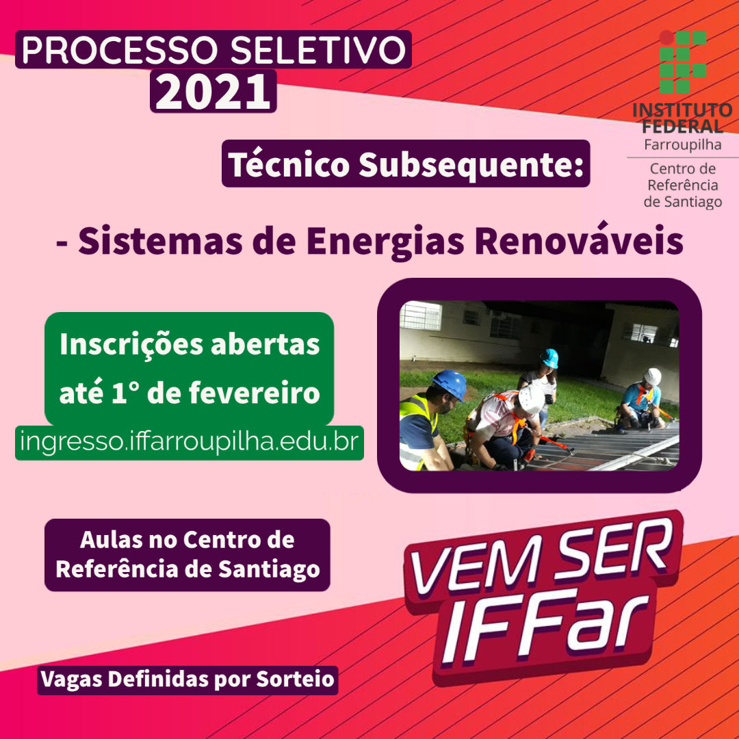 Neste ano, em virtude da pandemia, as vagas serão definidas por sorteio. Então, não perca o período de inscrição que está aberto até o dia 1° de fevereiro através do site ingresso.iffarroupilha.edu.br