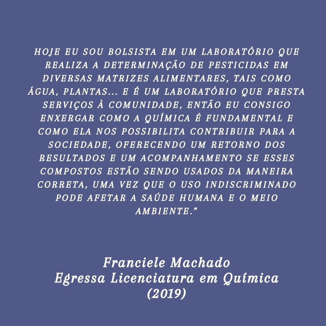 Hoje damos continuidade ao #OrgulhoIFFar trazendo um pouco da trajetória de Franciele Machado, egressa dos cursos Técnico em Química e de Licenciatura em Química.
