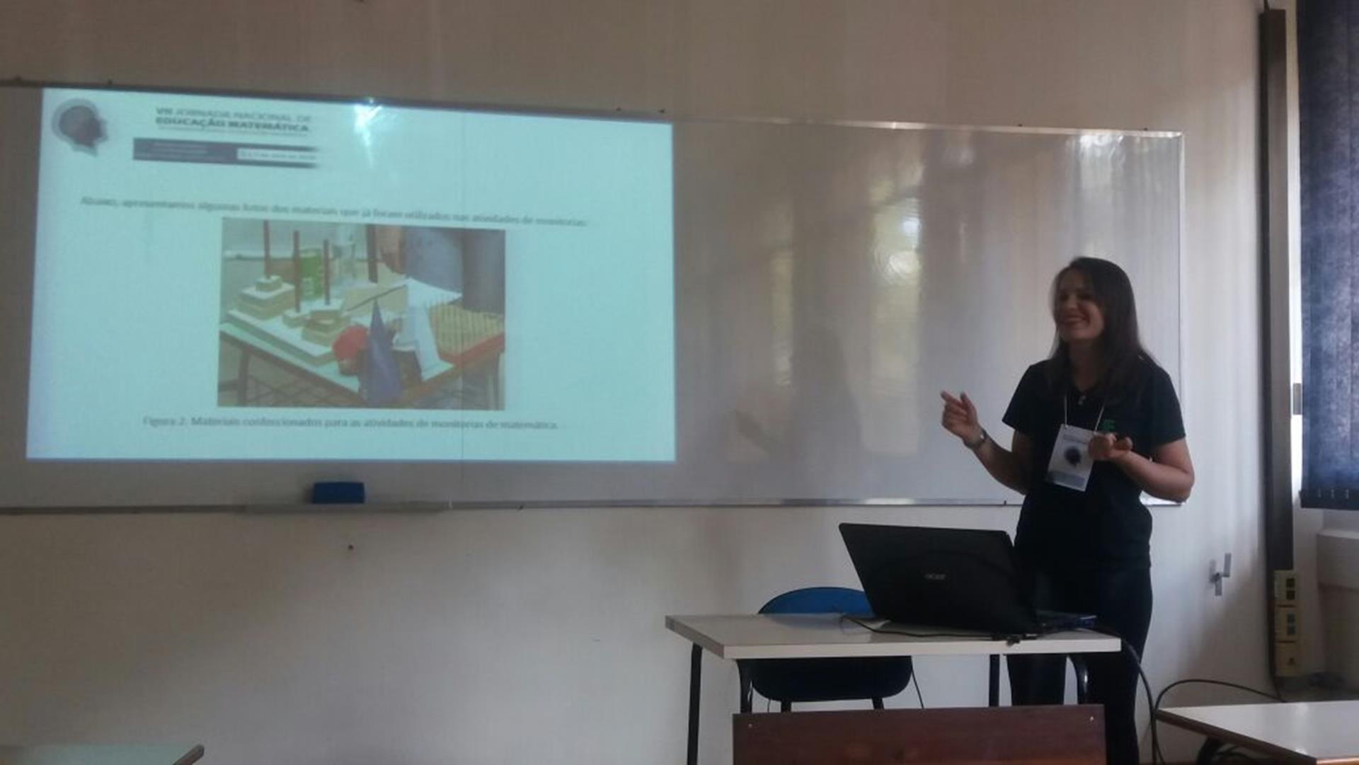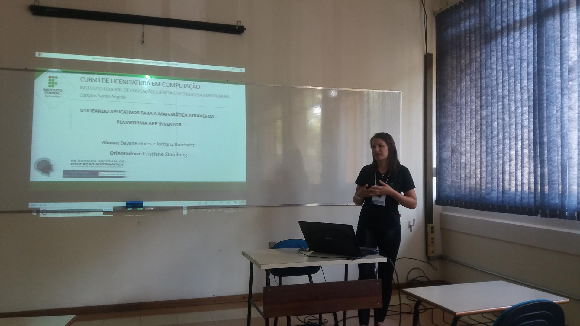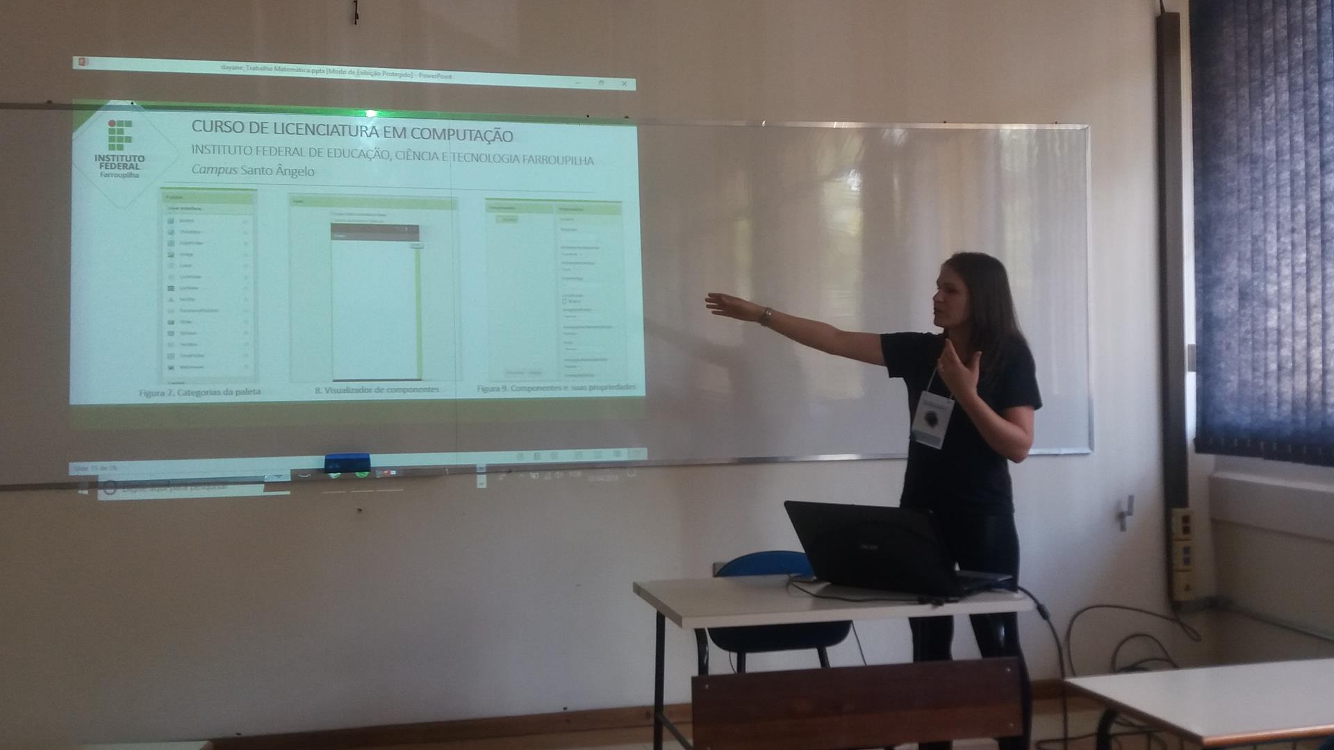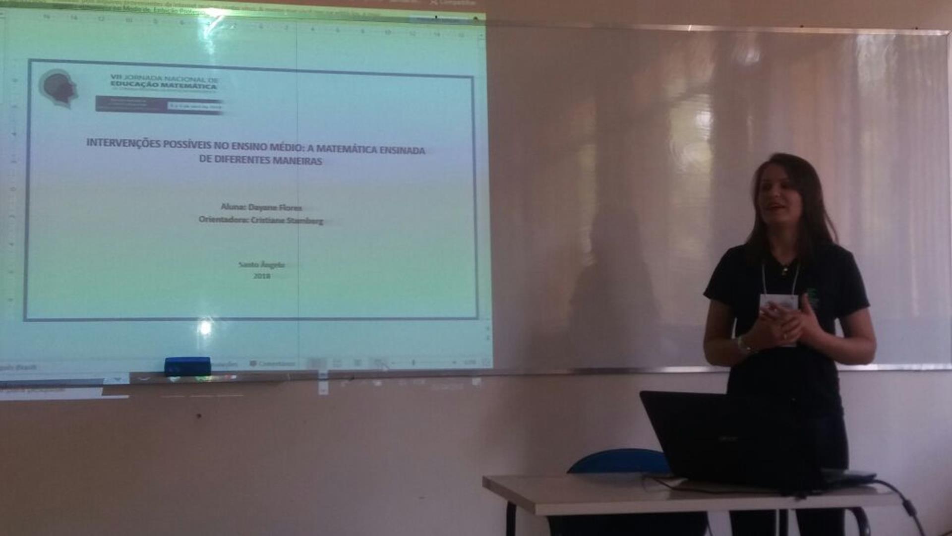 A aluna Dayane Flores explanou dois trabalhos “Utilizando Aplicativos Para A Matemática Através Da Plataforma App Inventor”, escrito em conjunto com a também aluna do curso Jordana Borchartt e orientado pela professora Cristiane Da Silva Stamberg - professora de Matemática. O seguinte foi “Intervenções Possíveis No Ensino Médio: A Matemática Ensinada De Diferentes Maneiras”, apresentação que remete ao Projeto de Ensino de Monitoria em Matemática e diferentes metodologias utilizadas na disciplina, também orientado pela professora Cristiane, durante os anos de 2015, 2016 e 2017.