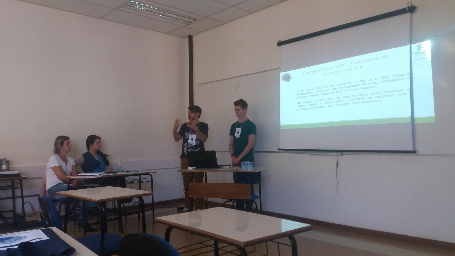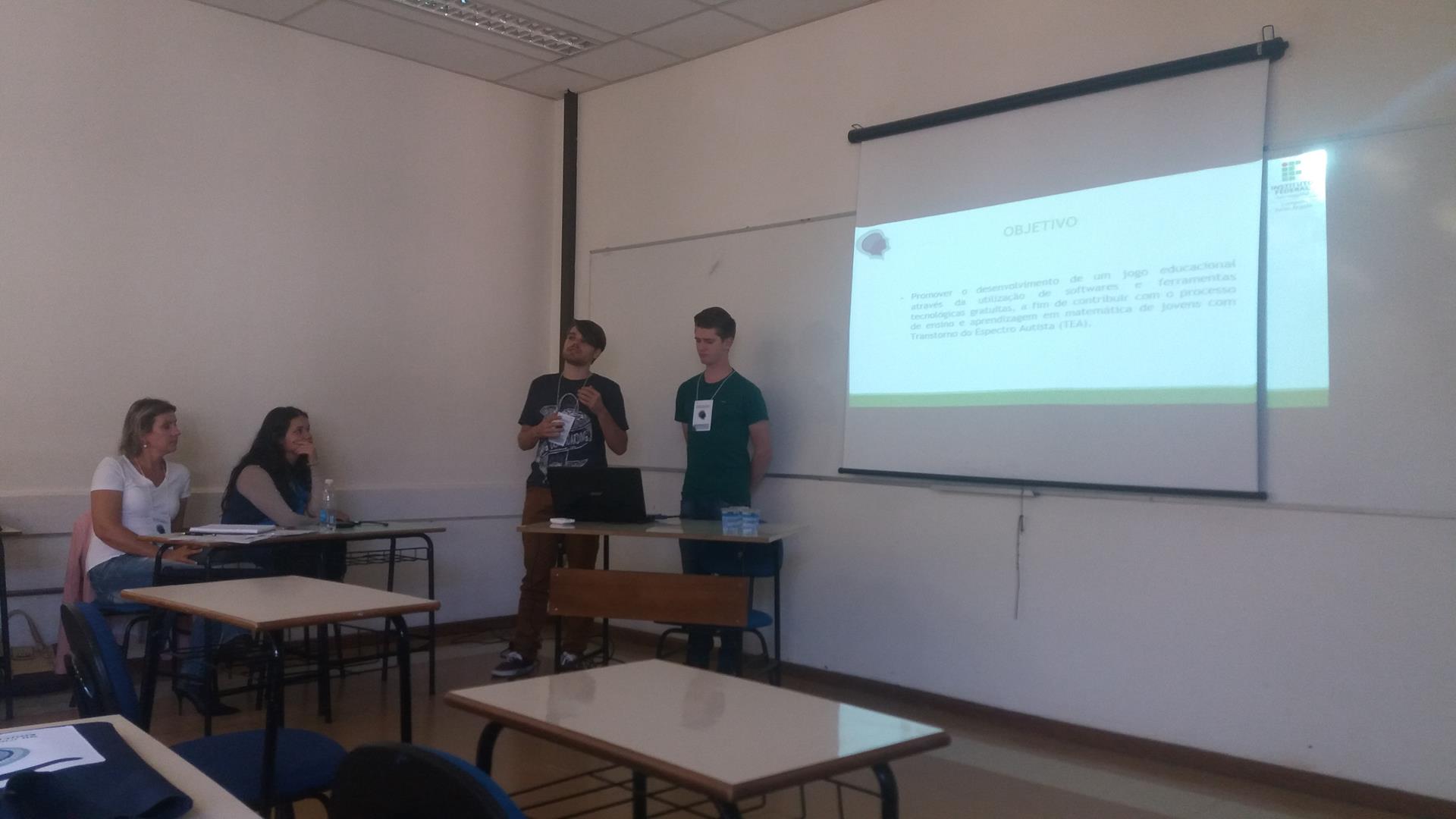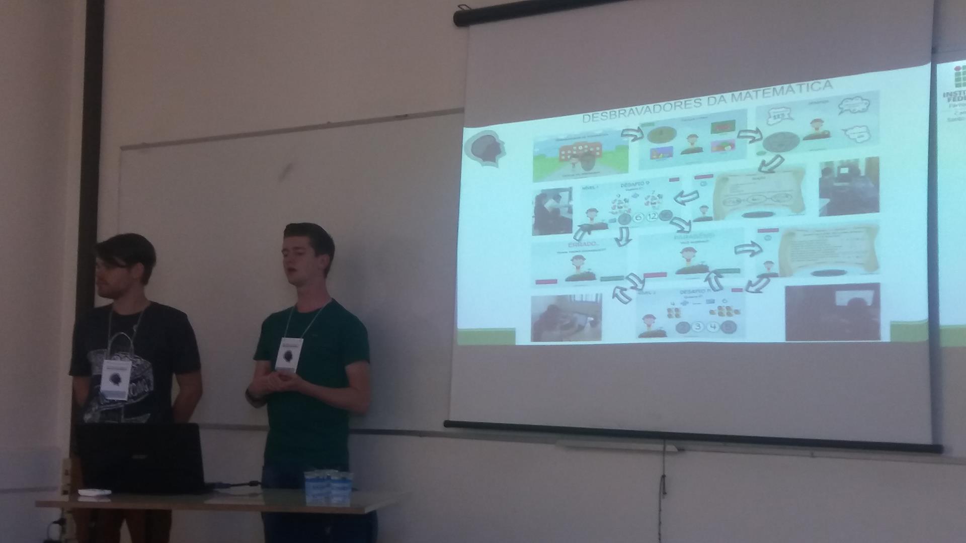 Os alunos Anderson e Samuel apresentaram “A Criança com Transtorno do Espectro Autista e a Tecnologia no Ensino das Operações Básicas Matemáticas através de um Jogo Computacional”, trabalho escrito também em conjunto com a professora Cristiane Stamberg e orientado por Andréa Pereira - professora de Informática. O trabalho apresentou os resultados alcançados nos anos de 2017 do Projeto de Pesquisa “O Ensino e a Aprendizagem em Matemática com o Auxílio de Ferramentas Tecnológicas”, que visa produzir um jogo matemático como ferramenta auxiliar para a aprendizagem de matemática para Jovens com Espectro Autista.