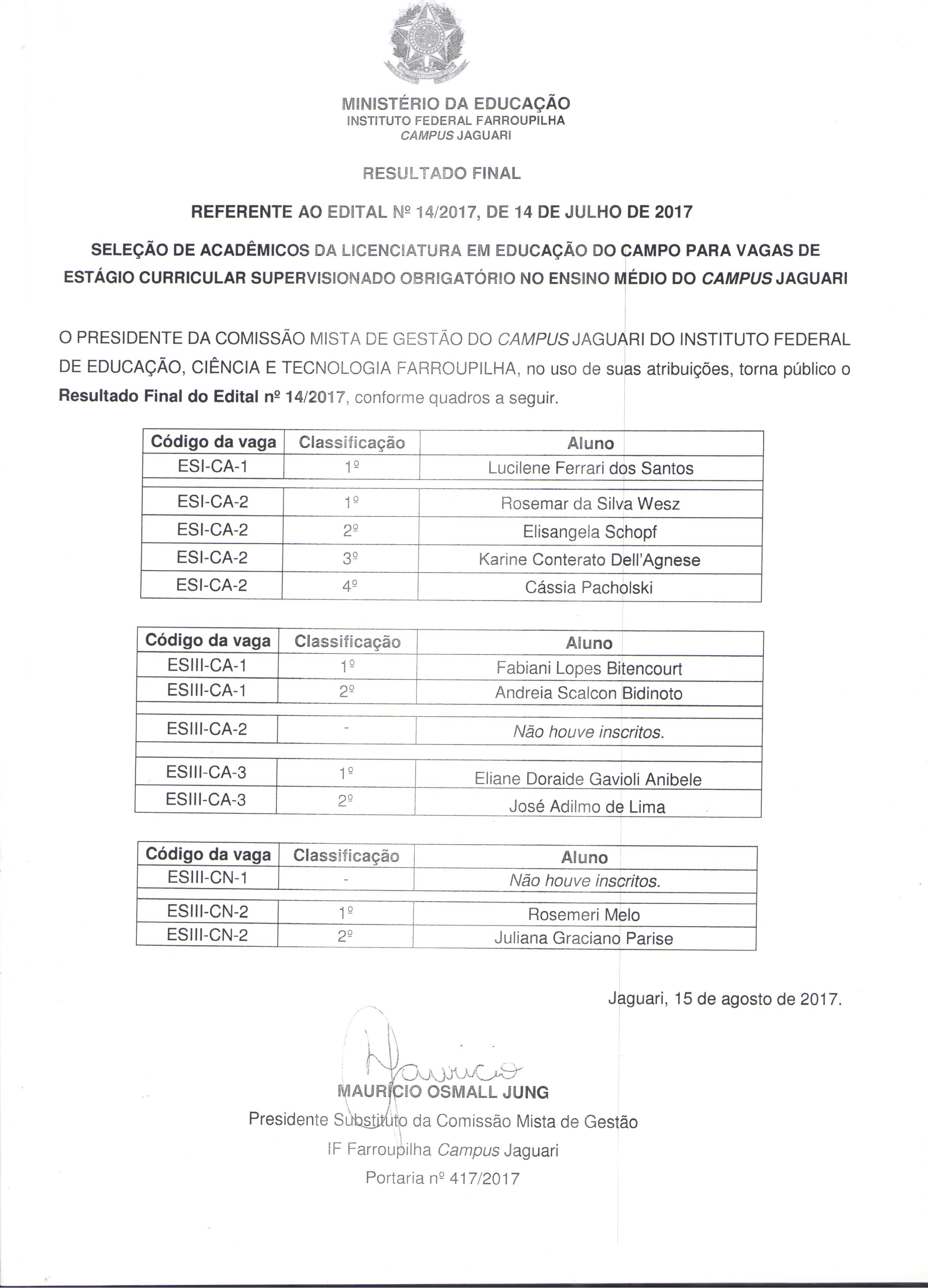 Edital 14/2017 - Seleção de alunos da LEDOC para estágio Curricular Obrigatório no Campus Jaguari