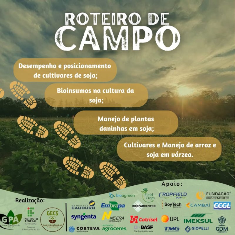 O roteiro prevê estações sobre desempenho de cultivares de soja, bioinsumos na cultura da soja, manejo de plantas daninhas da soja, e manejo de arroz e soja em várzea.