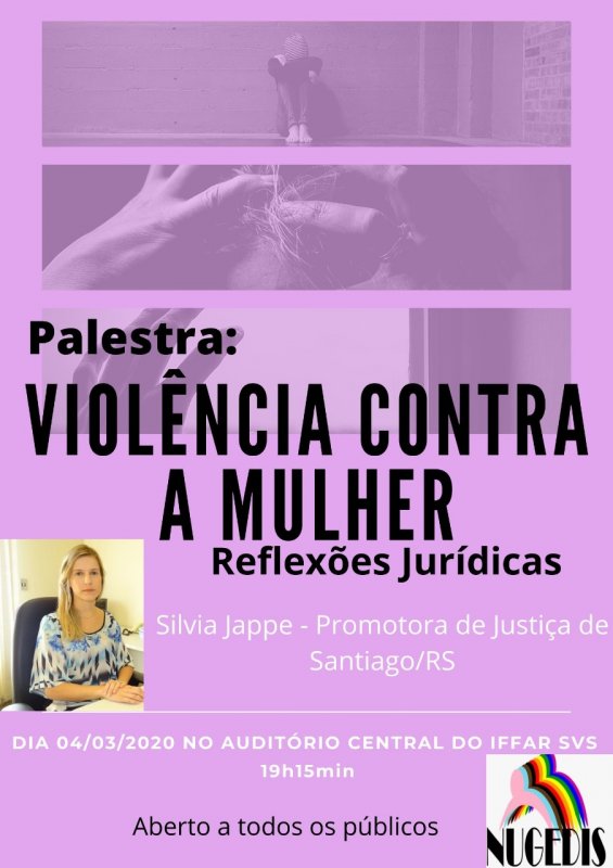 Em alusão ao Dia Internacional da Mulher, o Núcleo de Gênero e Diversidade Sexual (NUGEDIS) do Instituto Federal Farroupilha - Campus São Vicente do Sul promove a palestra "Violência contra a mulher: Reflexões jurídicas", com a promotora Silvia Jappe. O evento é gratuito e aberto a toda comunidade.