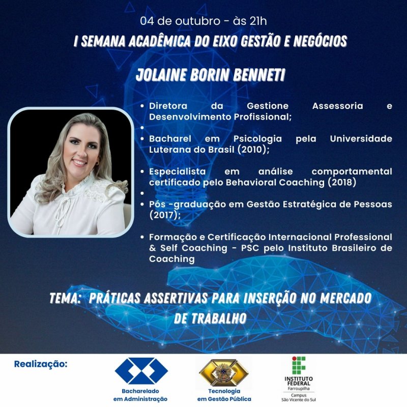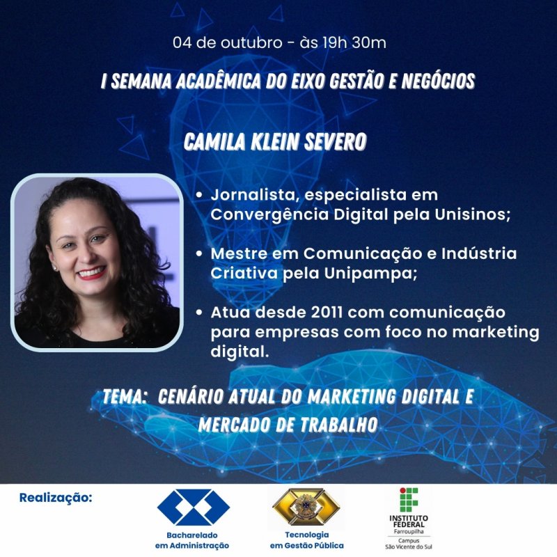 De 3 a 5 de outubro, ocorre, no Campus São Vicente do Sul, a 1º edição da Semana Acadêmica do Eixo de Gestão e Negócios, que envolve os cursos de Bacharelado em Administração e Tecnologia em Gestão Pública. O evento objetiva aproximar acadêmicos e acadêmicas do mundo do trabalho e refletir sobre as perspectivas e os desafios desses profissionais para o futuro.