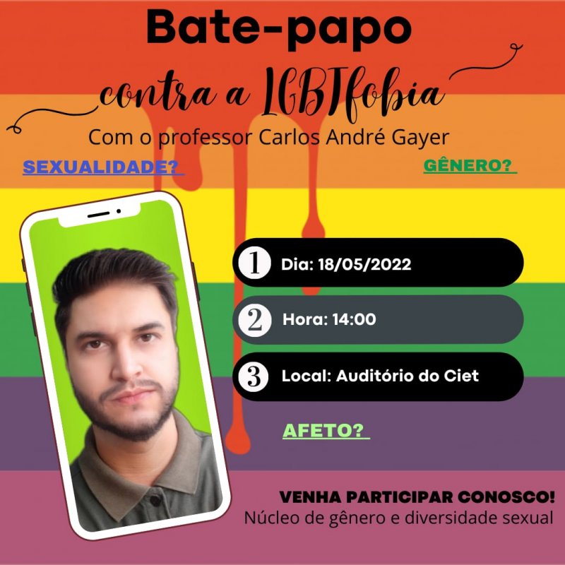 Na próxima quarta-feira, dia 18/05, irá acontecer o Bate-Papo contra a LGBTfobia, com o professor Carlos André Gayer.