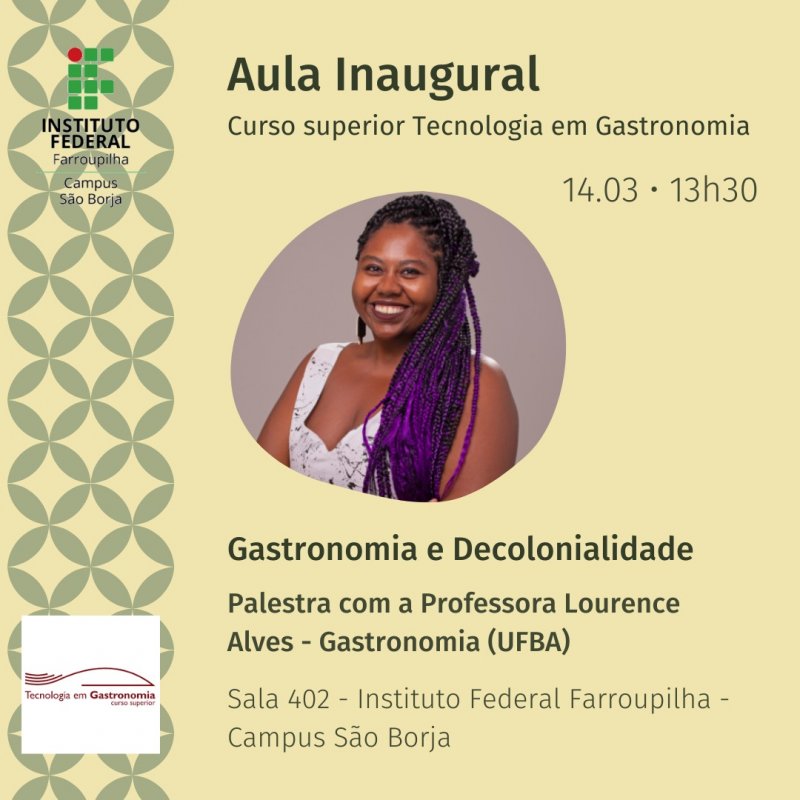 Na quinta-feira, 14/03/2024, às 13:30h, na sala 402, acontecerá a Aula Inaugural do Curso de Tecnologia em Gastronomia - em parceria com o Nugedis e Neabi. Como convidada, teremos a palestrante Professora Dra. Lourence Alves, da Universidade Federal da Bahia, falando sobre o tema Gastronomia e Decolonialidade. A atividade estará aberta aos docentes e discentes da instituição que queiram também dialogar sobre novos e necessários olhares sobre as Gastronomias.